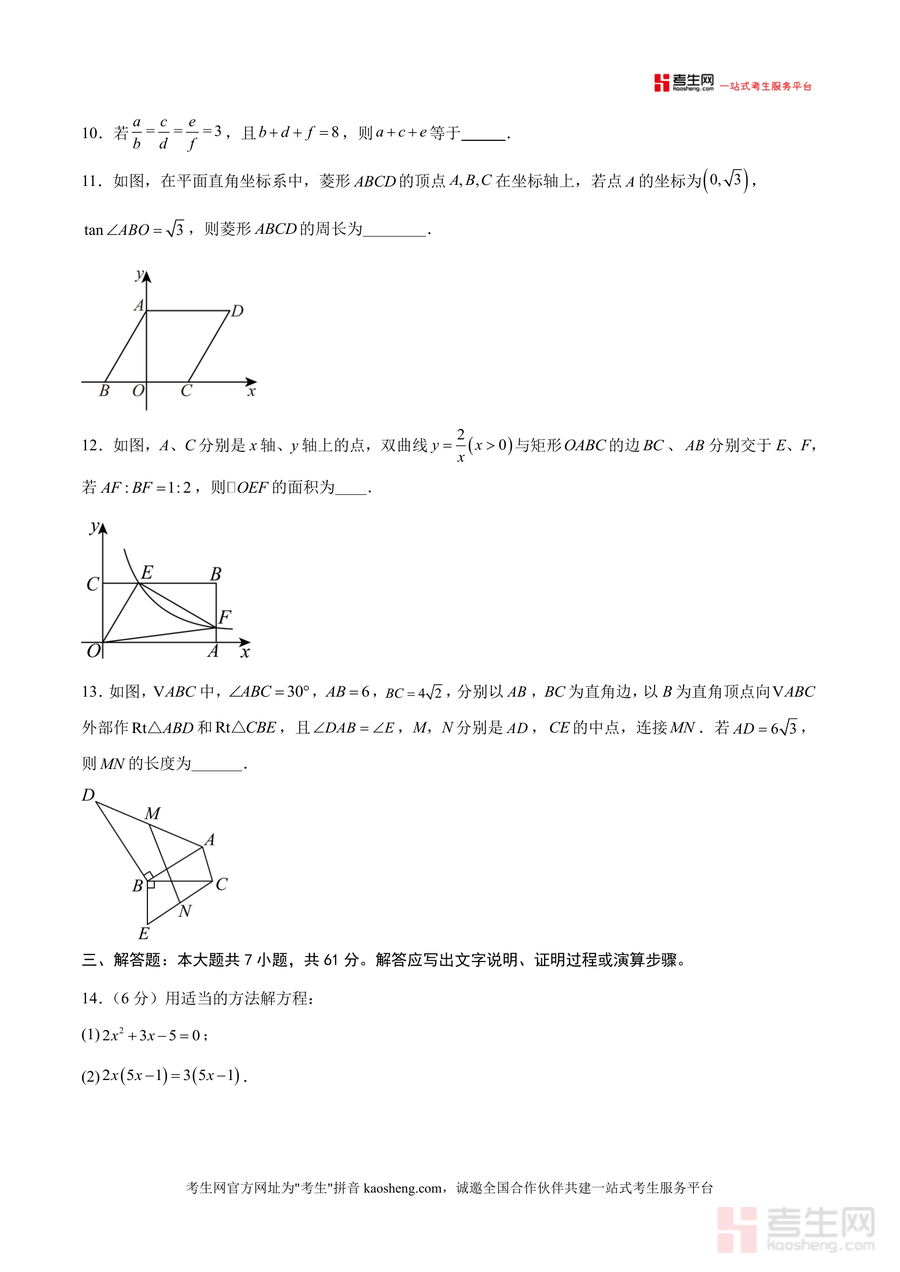 这份资料的核心用途是助力九年级学生进行月考前的针对性复习与应试能力提升。使用场景包括课堂限时模拟测试以训练时间管理能力、课后自主练习以巩固薄弱知识点、教师用于课堂教学评估以掌握学生阶段学习情况。用户价值体现在:通过选择第8题矩形对角线动点最值问题可检测几何综合应用能力,通过解答第17题图解方程可深化代数与几何融合思维;教师可依据答题数据精准定位学生共性问题(如一元二次方程配方错误、概率计算逻辑疏漏),调整教学重点。备考优势显著:题目设计紧密贴合教材考点与月考命题趋势,能有效帮助学生熟悉考试节奏,提升知识综合运用能力与应试技巧。