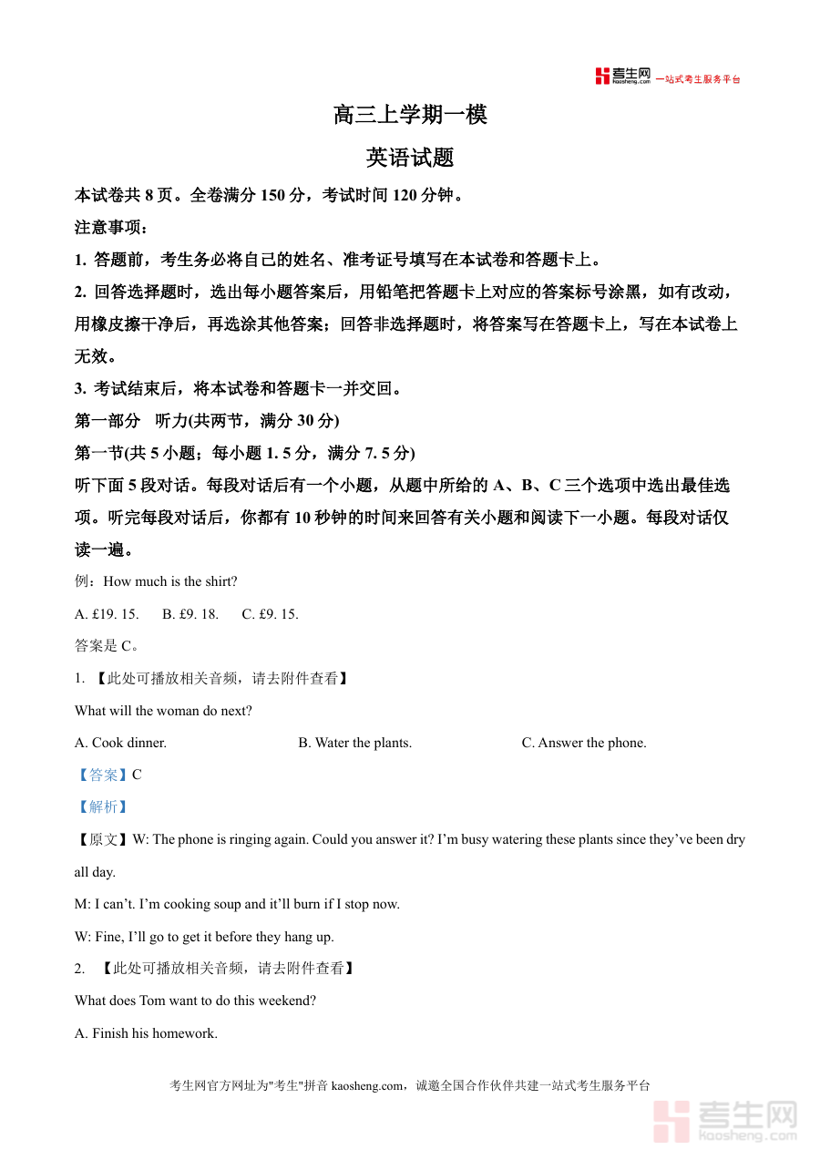 该资料的核心用途是帮助学生熟悉高三上学期一模考试的题型结构、难度梯度及命题风格,适用场景包括课堂同步练习、课后自主复习、考前模拟测试等。用户价值体现在通过真题解析能有效提升应试能力,尤其是听力理解、选项分析与解题逻辑构建能力;备考优势在于精准把握本地命题方向,助力学生查漏补缺,优化解题策略,高效利用复习时间。