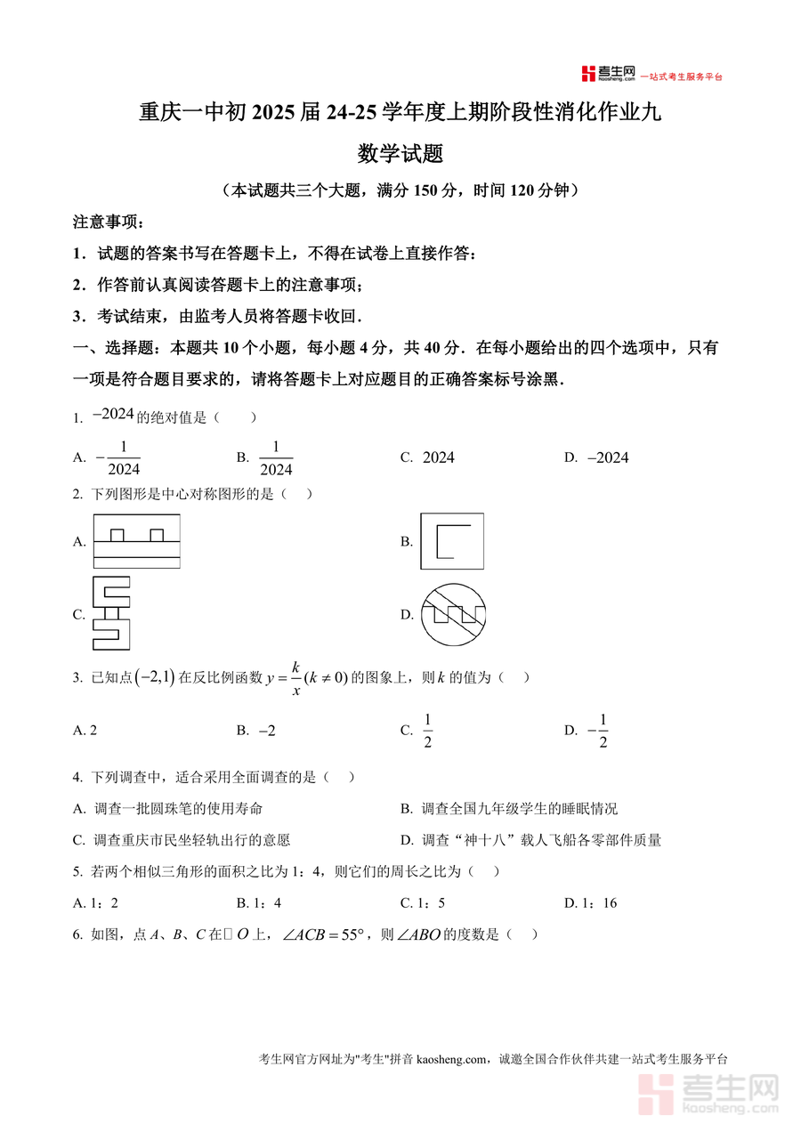 《精品解析:重庆市第一中学校2024-2025学年九年级上学期阶段性数学练习九(原卷版).docx》是一份针对九年级数学阶段性复习的标准化实战练习资料,由重庆一中命题,涵盖选择题(10题)、填空题(8题)、解答题(8题)三大核心题型,内容覆盖绝对值计算、中心对称图形识别、反比例函数应用、相似三角形性质、概率统计等九年级上册核心知识点。其特色亮点在于严格遵循中考命题规范,题型设置贴合重庆本地中考趋势,题目梯度合理,从基础到综合逐步提升,能全面检测学生的知识掌握程度。