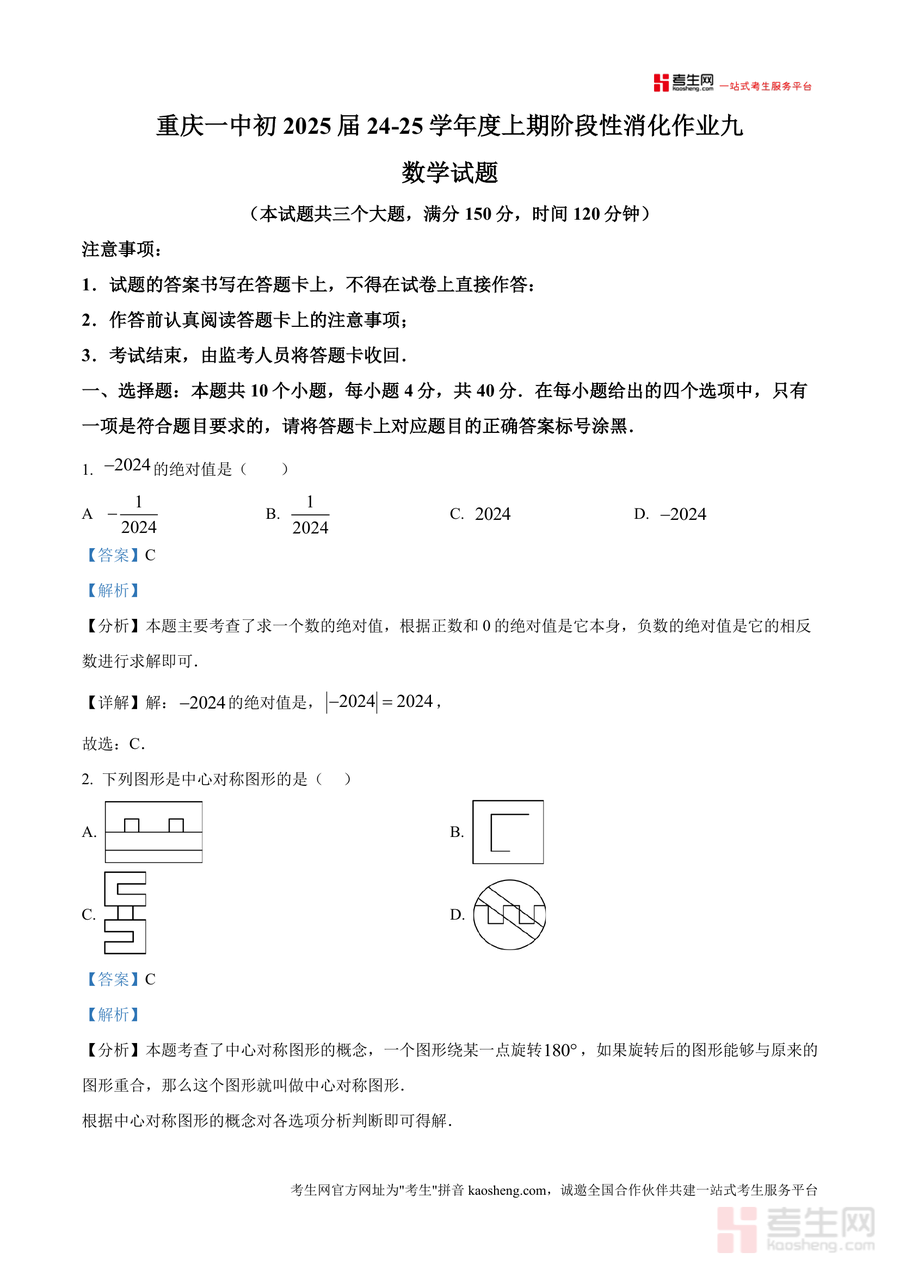 《精品解析:重庆市第一中学校2024-2025学年九年级上学期阶段性数学练习九(解析版)docx》是一份针对九年级上册数学阶段性复习需求设计制作高质量备考资料,涵盖选择题、填空题等核心题型,内容贴合重庆一中教学进度与考试命题风格。每份题目均配备详尽真题解析——包含考点定位(如绝对值、中心对称图形等基础考点)、解题步骤拆解及易错点提示(如分式方程整数解分析中的定义域注意事项),既呈现正确答案又梳理思维路径,帮助学生理解知识本质而非机械记忆,为后续学习筑牢基础。