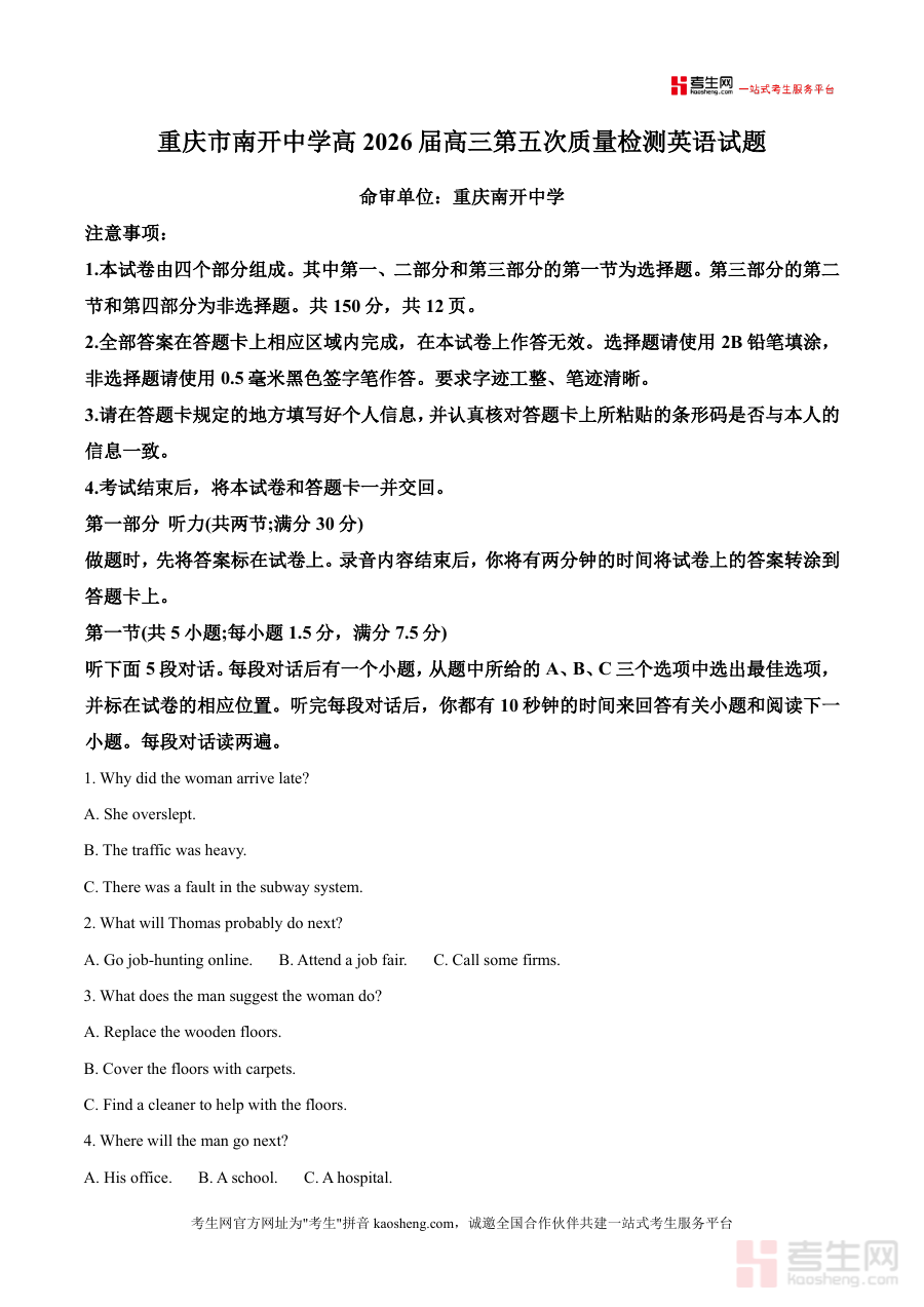 《精品解析:2026届重庆市沙坪坝区重庆市南开中学校高三上学期一模英语试题(原卷版)》是一份针对2026届高三学生的高质量英语备考资料,由重庆南开中学权威命审,完整呈现了高三上学期一模考试的英语试题原貌。资料涵盖听力、阅读理解、非选择题等高考英语核心题型板块,严格遵循高考试卷结构与答题规范要求(如答题卡使用说明、题型分值分布等),保留了原卷的命题细节与难度梯度,为学生提供了贴近真实考试场景的训练素材。其特色亮点在于依托南开中学深厚的教学教研经验,试题内容紧密贴合高考命题趋势,具有较高的权威性与参考价值。
