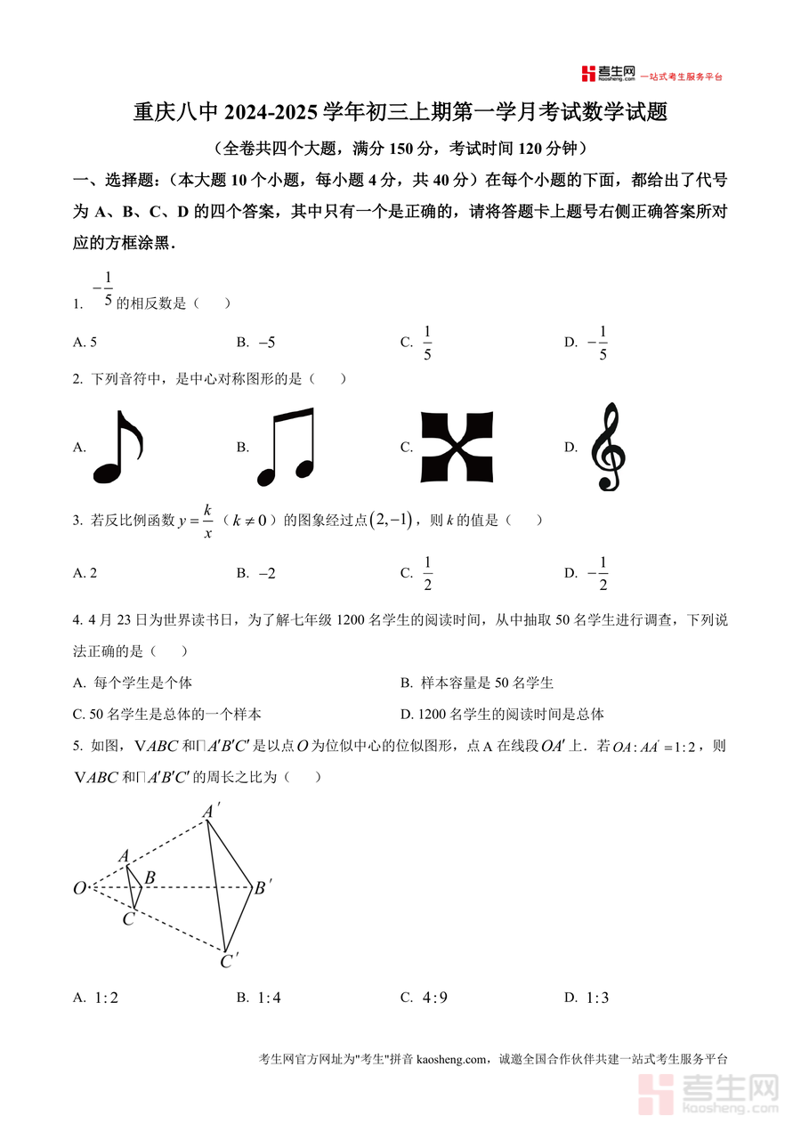 《精品解析:重庆市第八中学校2024—2025学年上学期第一学月考试九年级数学试题(原卷版)》是一份聚焦重庆本地九年级数学阶段性测评需求的权威备考资料。该资料严格遵循重庆中考数学命题框架设计,包含选择题、填空题、解答题共四个大题,满分150分且考试时长设定为120分钟;试题覆盖相反数、中心对称图形、反比例函数、统计概念、位似图形、规律探究、二次函数顶点坐标等九年级核心知识点与能力考点,其题型结构与难度梯度贴合重庆重点中学教学测评标准,能精准反映阶段学习成果。