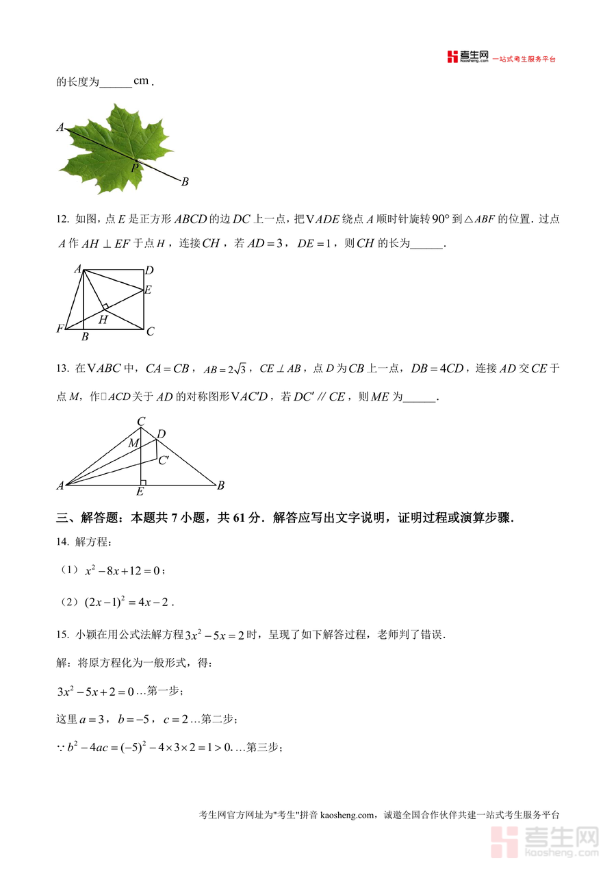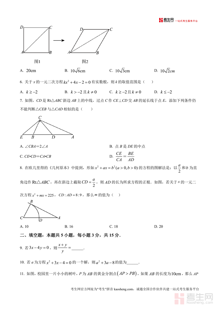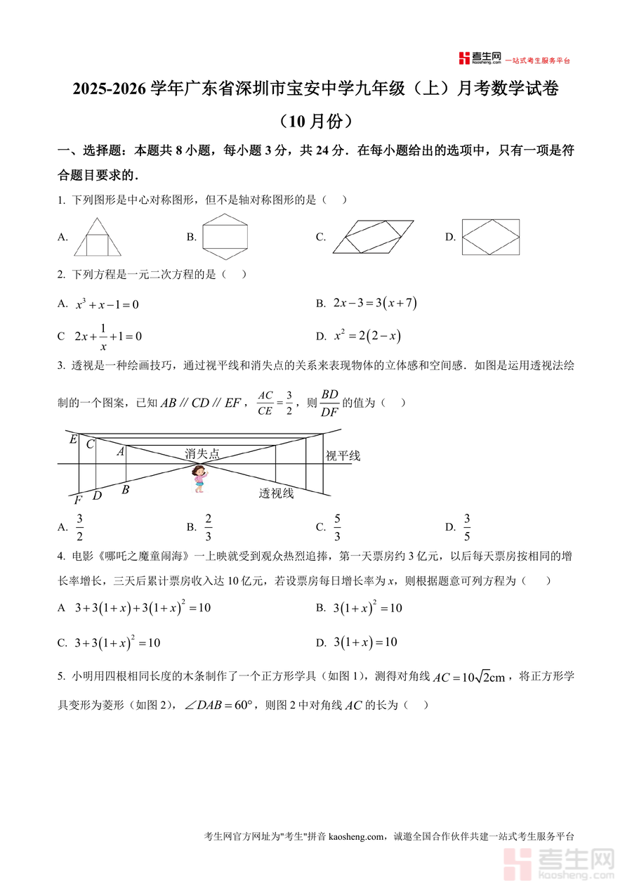 《精品解析:广东省深圳市宝安中学2025-2026学年九年级上学期月考数学试卷(10月)(原卷版).docx》是一份针对深圳市宝安中学九年级上学期数学阶段性检测的权威备考资料,真实还原该校月考命题场景,核心内容涵盖8道选择题、5道填空题及7道解答题,题型覆盖一元二次方程解法、中心对称与轴对称图形判断、相似三角形应用、黄金分割计算、正方形旋转变换等九年级上册数学核心知识点。其特色亮点在于贴合深圳中考数学命题趋势,精准反映宝安中学作为区域名校的教学重点与能力考查方向,试卷结构严谨,考点分布均衡且具有典型性,能帮助使用者快速把握阶段性学习重点与命题规律。