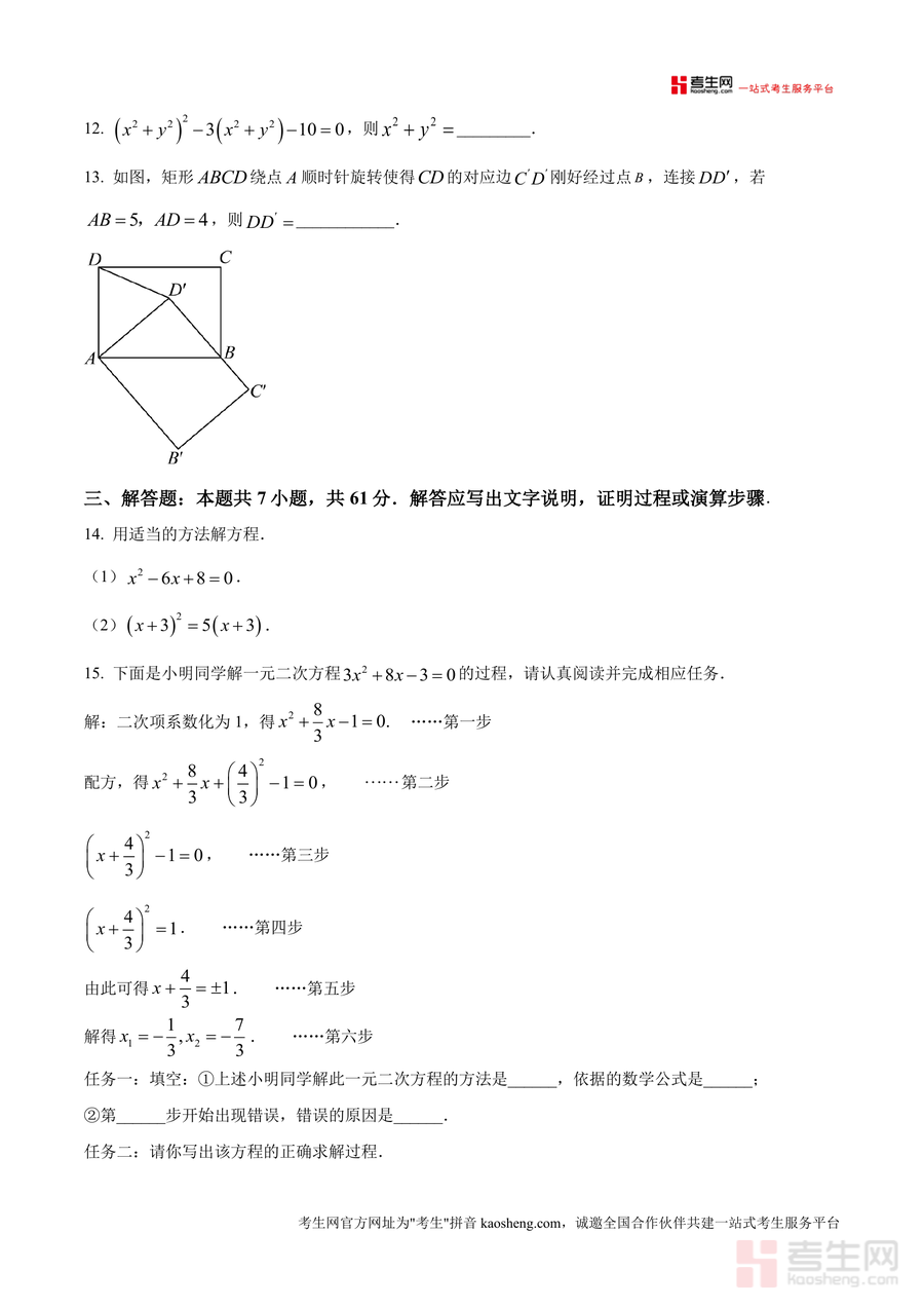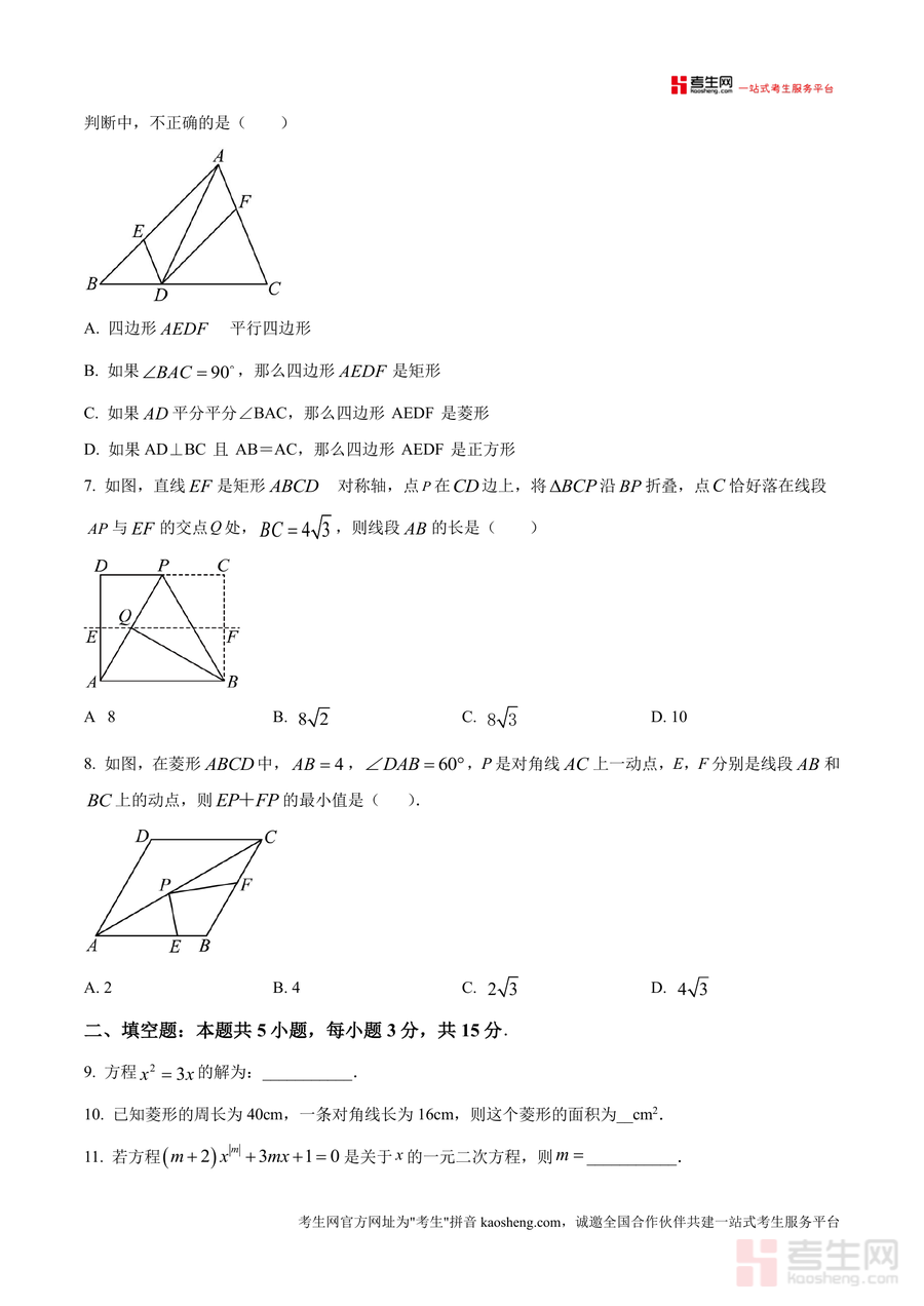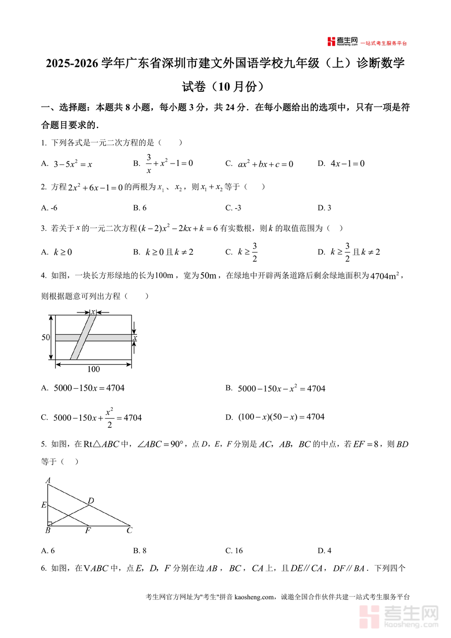 《精品解析:广东省深圳市建文外国语学校2025-2026学年九年级上学期诊断数学试卷(10月份)(原卷版).docx》是一份针对深圳市建文外国语学校九年级上学期10月诊断考试设计的专业数学备考资料。试卷包含选择题8小题(共24分)、填空题5小题(共15分)、解答题7小题(共61分)三大题型模块,覆盖一元二次方程解法与应用、四边形(矩形、菱形、正方形)性质与判定、几何变换、实际问题建模等核心知识点,特色在于贴合深圳本地教学进度与中考命题趋势,能精准检测学生阶段性学习效果,为后续复习提供明确方向。