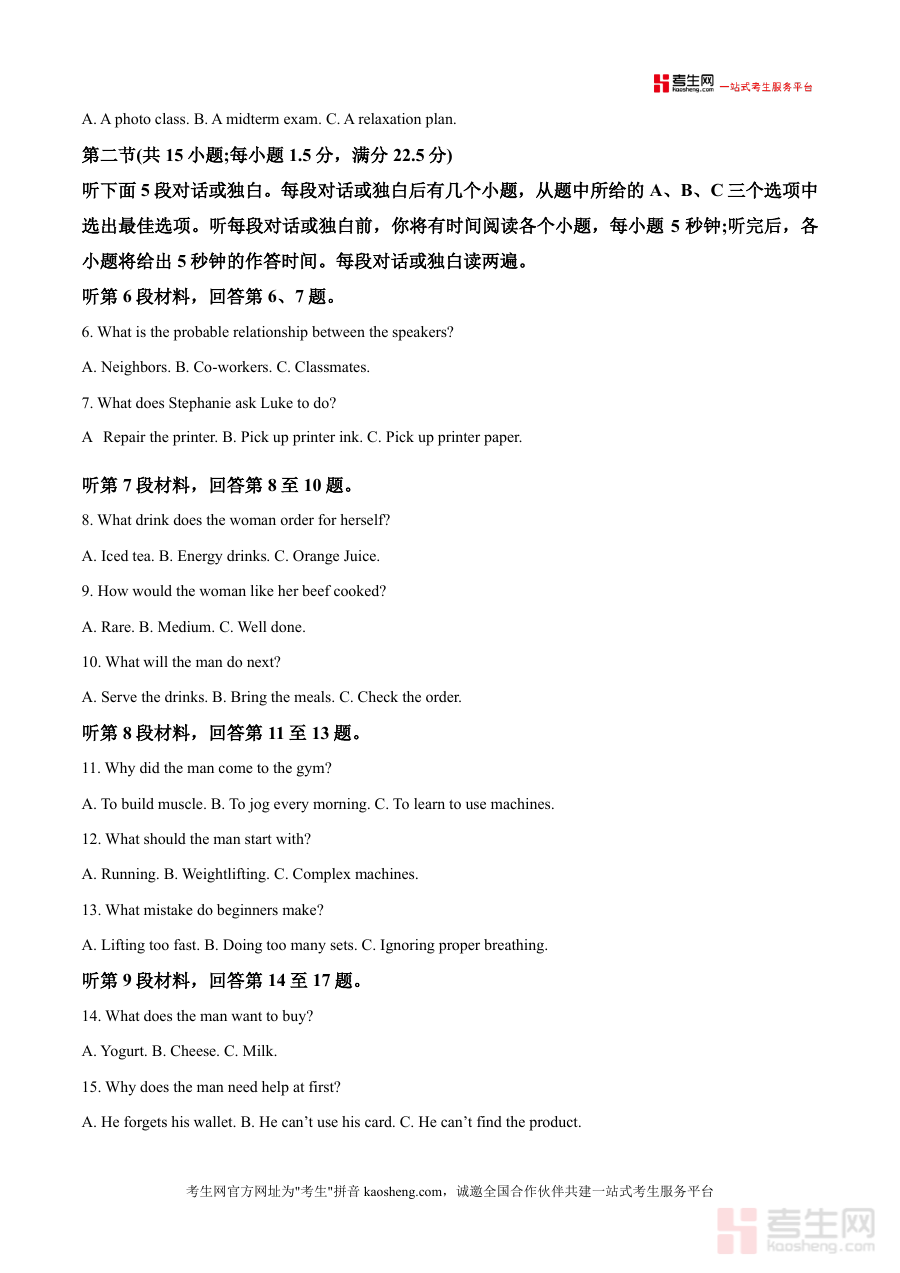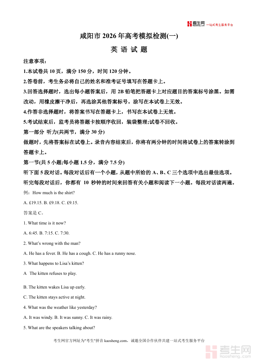 《精品解析:2026届陕西省咸阳市高三上学期一模考试英语试题(原卷版).docx》是一份服务于2026届陕西省咸阳市高三学生的核心高考英语备考资料,完整收录了咸阳一模考试的英语试题原卷内容,涵盖听力(含短对话、长对话及独白)、阅读等高考必考题型,并附带规范的答题注意事项与考场要求说明。该资料严格依据高考英语考试大纲编制,题型设置、分值分布与时间分配均与高考标准保持一致,能精准体现咸阳地区高考模拟检测的命题思路与难度梯度。其特色在于还原了考试的真实场景细节,如答题卡填涂规范、题目序号编排等,为使用者营造沉浸式模拟考试体验,助力提前适应考场环境。