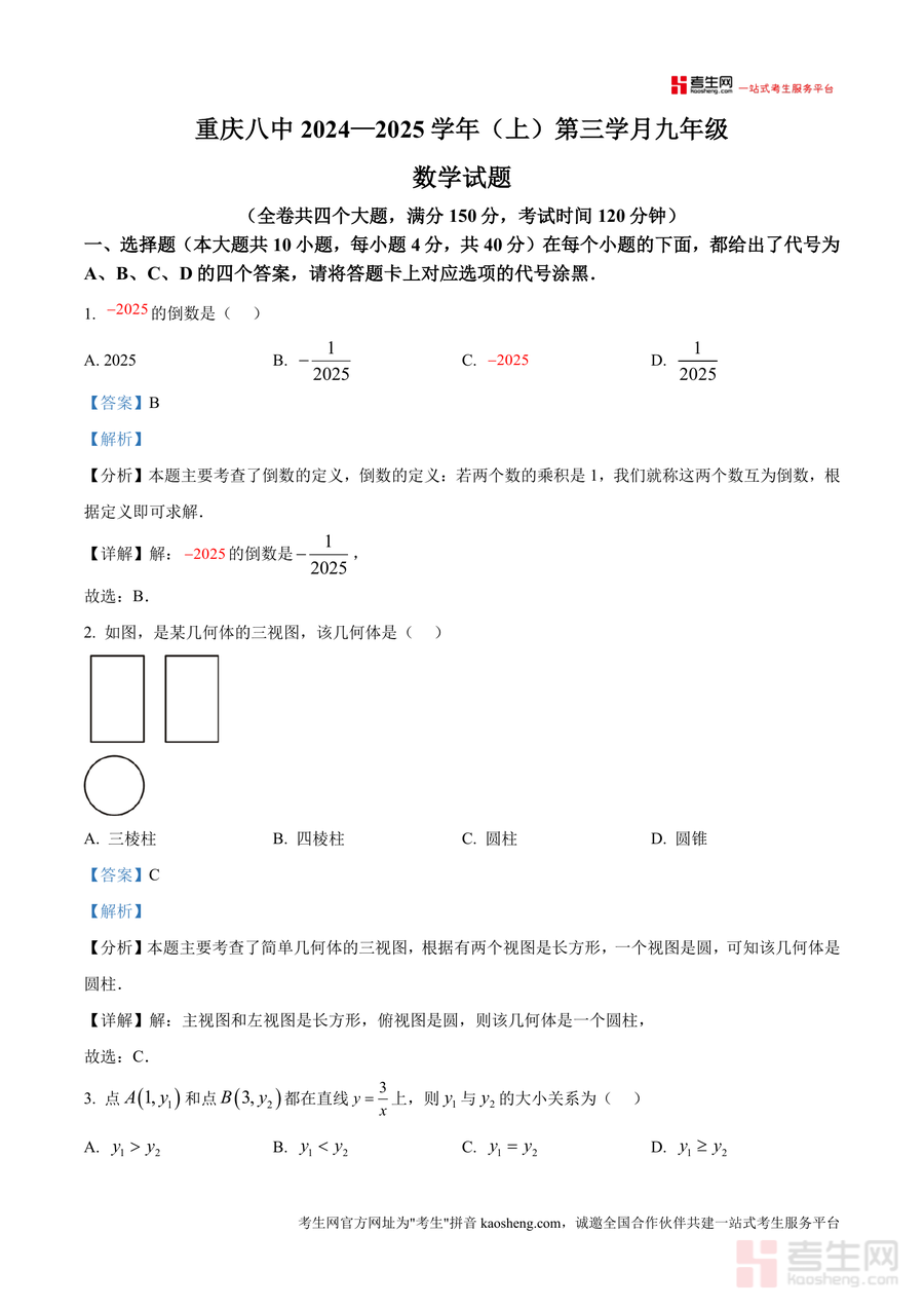 《精品解析:重庆市第八中学校2024—2025学年九年级上学期第三学月月考数学试题(解析版).docx》是一份针对重庆八中九年级数学阶段性测评 的专业备考资料。文件包含完整试题及逐题解析,试题覆盖选择题(10小题)、填空题(8小题)、解答题(8小题)共四个大题,满分150分;解析部分针对每道题核心考点(如倒数定义、三视图识别、反比例函数增减性、多边形内角和等)进行深度剖析,明确解题思路与规范步骤,并补充知识点拓展及易错点提示,帮助学生理解考点本质。其特色在于贴合该校教学进度与命题风格,解析注重逻辑推导与方法总结,助力学生掌握高效解题技巧。