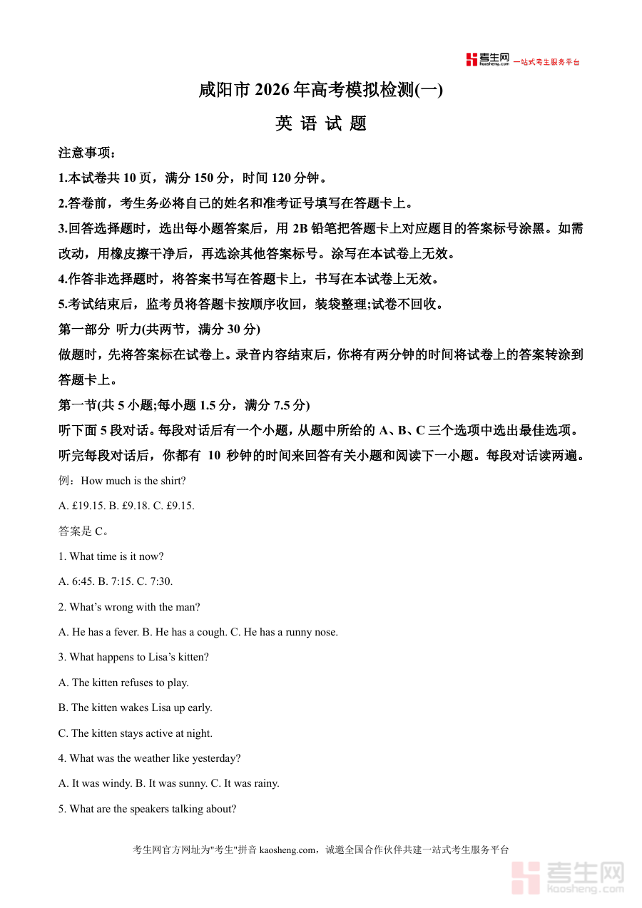 《精品解析:2026届陕西省咸阳市高三上学期一模考试英语试题(解析版)》是一份针对2026届陕西省咸阳市高三学生英语备考的专业真题解析资料。该资料完整呈现了本次一模考试的全部试题内容,包括听力、阅读、语言知识运用及写作等核心模块,并配备了详尽的答案解析与解题思路。其特色亮点在于解析部分不仅提供正确答案,还深入剖析题目设计意图、考点分布及常见错误原因,同时融入实用的应试技巧指导,如听力理解中的关键信息捕捉方法、阅读理解中的主旨大意归纳策略等,帮助使用者全面掌握试题背后的知识体系与答题逻辑。
