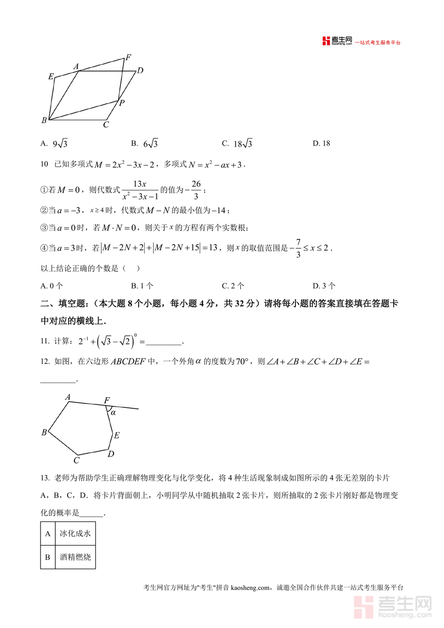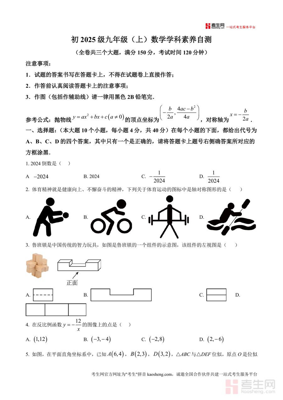 《精品解析:重庆市第十一中学校2024-2025学年上学期九年级数学学科素养12月自测(原卷版)》是一份针对九年级学生数学学科素养提升设计的阶段性自测备考资料。文件严格遵循考试规范,全卷分为三个大题共78分?不对,文件片段里说全卷满分150分考试时间120分钟。题型包括10道选择题(40分)、8道填空题(32分)及8道解答题(78分)。考查内容覆盖代数基础(如倒数计算、多项式性质判断)、几何图形变换(轴对称、三视图、位似变换、圆与等腰直角三角形综合)、函数应用(反比例函数图像点判断、抛物线顶点公式应用)、概率统计(物理化学变化卡片概率计算)等核心模块。作为原卷版资料其完整保留了考试原题结构与答题规范贴合重庆本地教学要求与中考命题趋势能真实反映学生当前学习水平