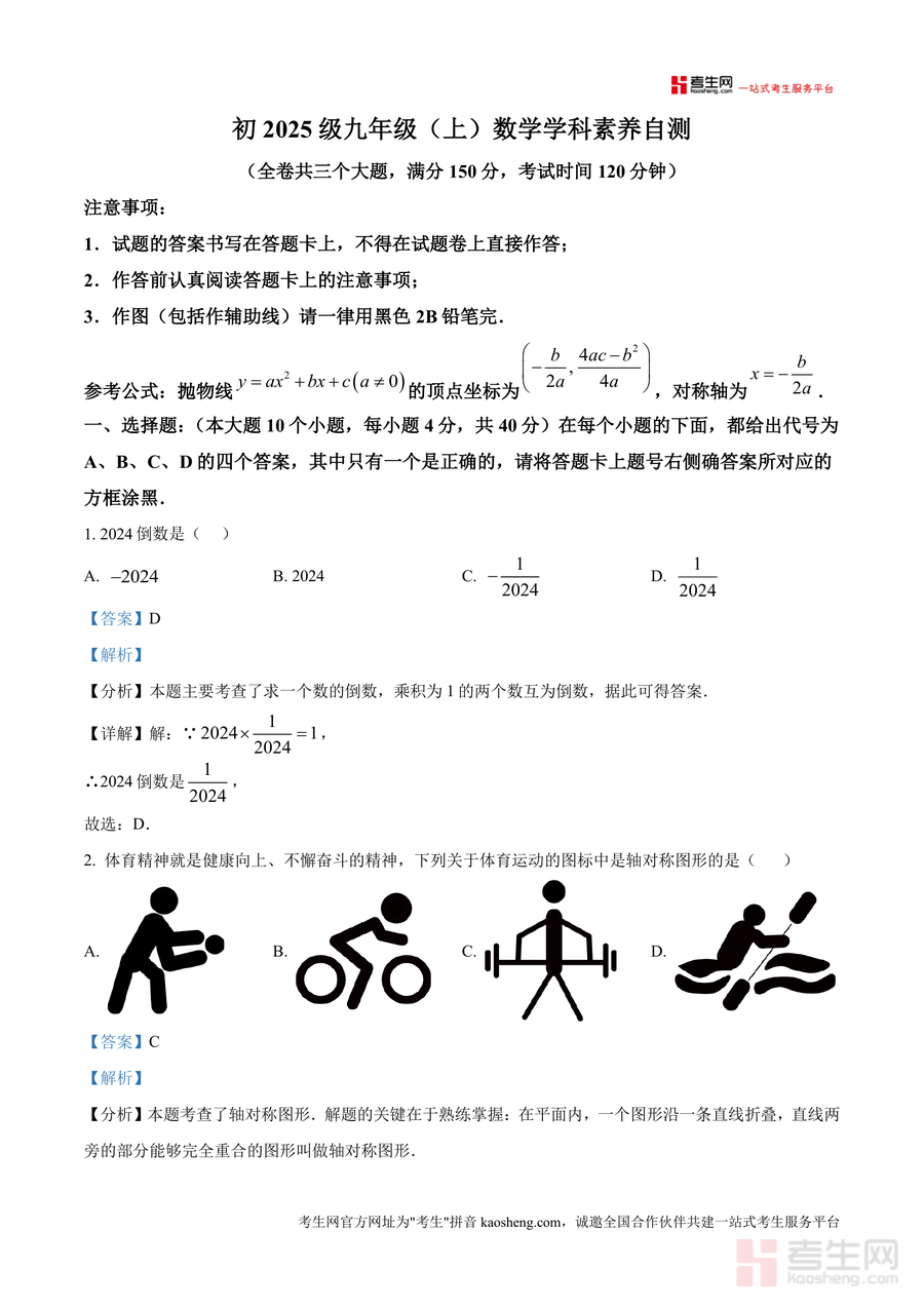 《精品解析:重庆市第十一中学校2024-2025学年上学期九年级数学学科素养12月自测(解析版).docx》是一份针对九年级数学阶段性自测需求打造的专业备考资料,聚焦学科素养提升与应试能力培养。文件包含全卷三个大题(选择题10道、填空题8道及解答题)共150分完整题型,解析部分覆盖每道题的考点分析、解题步骤与易错点提示,如选择题中对倒数概念、轴对称图形判定等基础知识点精准拆解,填空题中增长率问题建模方法,解答题中几何变换与函数综合题目的分步推导,充分体现真题解析深度与实用性。