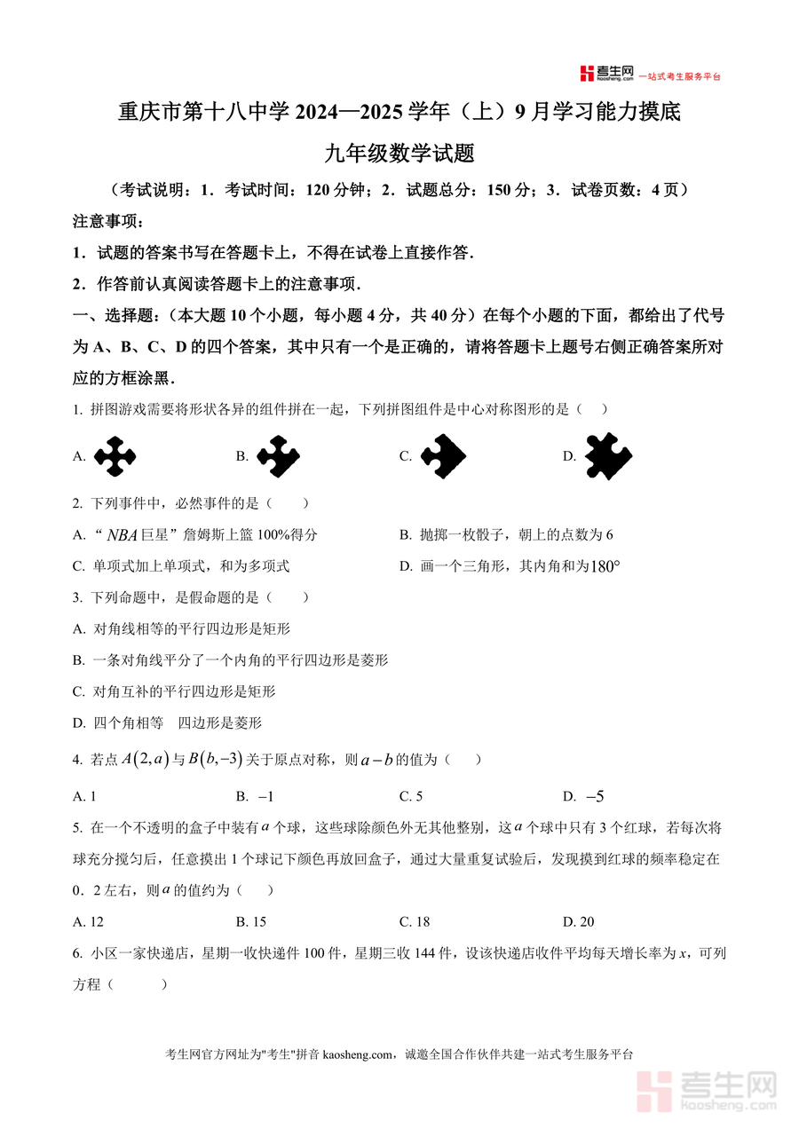 《精品解析:重庆市第十八中学2024-2025学年九年级上学期9月学习能力摸底考试数学试题(原卷版)》是一份针对九年级数学学科的高质量阶段性备考资料,涵盖完整考试结构与核心题型。该试题严格遵循重庆本地教学大纲要求设计,考试时长120分钟、总分值150分,包含选择题(10小题共40分)、填空题(8小题共32分)及解答题(8小题共78分)三大模块,题目覆盖中心对称图形判断、概率计算、一元二次方程应用、几何证明等九年级上册核心知识点,同时融入本地学情特色,既注重基础知识考查又强调能力提升,能有效反映学生开学初期学习成果。