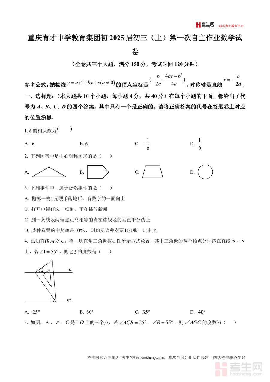 《精品解析:重庆市育才中学2024-2025学年九年级上学期第一次月考数学试题(原卷版)》是一份聚焦重庆市育才中学初三年级阶段性学业检测的权威备考资料,完整呈现了该校2024-2025学年上学期第一次自主作业数学试卷原貌。试卷设置全卷三个大题共26小题,满分150分考试时间120分钟,包含选择题(10题40分)、填空题(8题32分)、解答题(8题78分)三大题型;参考公式如抛物线顶点坐标与对称轴公式等细节清晰呈现,覆盖相反数、中心对称图形、必然事件、几何旋转、圆的性质、代数变形等九年级上册核心知识点,命题风格贴合该校教学进度与重点,能真实反映学生阶段性知识掌握情况。