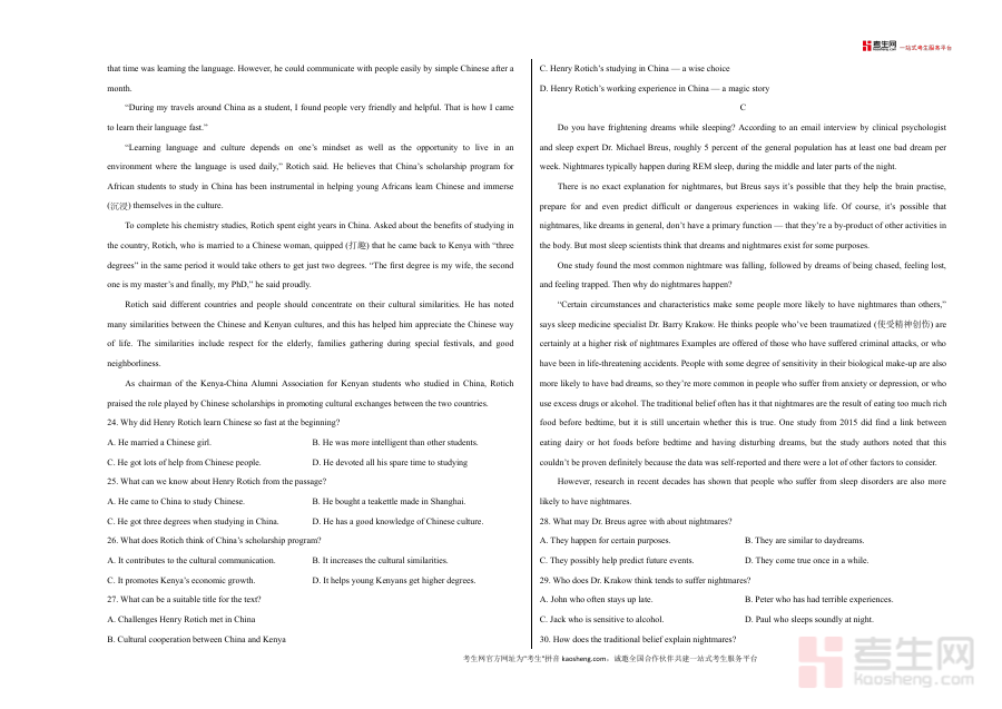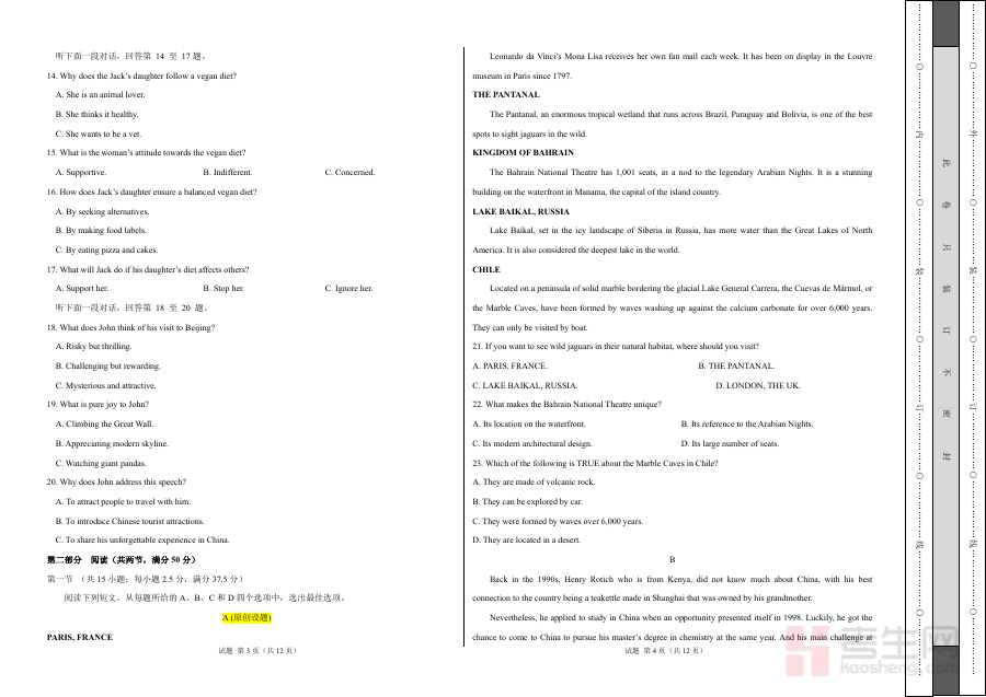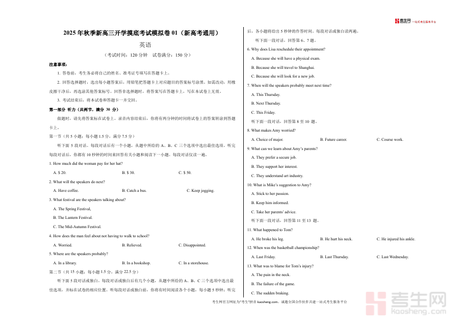 《英语01(新高考通用)(考试版A3)》是一份针对2025年秋季新高三学生的开学摸底考试模拟卷,严格遵循新高考英语考试标准设计的专业备考资料。文件内容涵盖听力(30分)、阅读(50分)等核心模块,听力部分包含5段短对话和5段长对话/独白,阅读部分则采用原创设题的多元主题文章(如文化地标、自然景观、个人经历等),完整还原新高考英语的题型结构与分值分布。其特色亮点在于贴近新高考命题趋势,融入真实语境素材,并以A3考试版格式呈现,便于学生模拟考场作答场景。