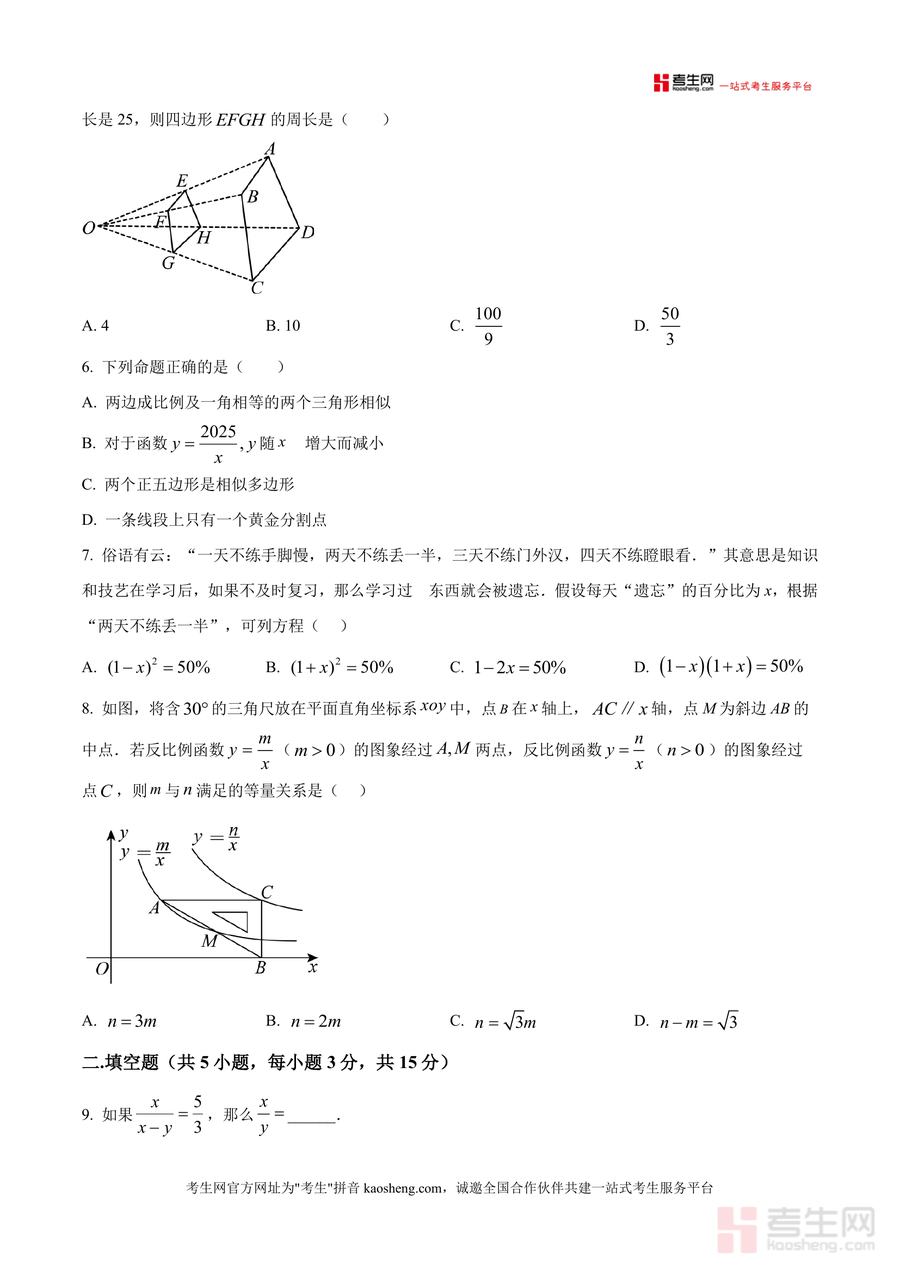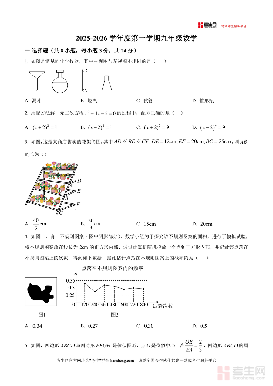 《精品解析:广东省深圳市宝安中学(集团)第二外国语学2025-2026学年上学期九年级数学1月月考试卷(原卷版).docx》是一份针对深圳市九年级数学月考设计的高质量备考资料,主要涵盖九年级上册核心知识点,包括一元二次方程配方法求解、相似图形判定与应用、反比例函数图像性质、概率统计计算及几何图形(矩形、菱形)证明与计算等题型。试卷题型结构严格遵循本地考试规范:8道选择题(共24分)、5道填空题(共15分)及7道解答题(共61分),特色亮点在于其源自宝安中学集团第二外国语学校真实月考原卷版,题目设计贴合深圳中考考纲要求,能精准反映该校教学重点与命题方向,为学生提供最贴近实际考试情境训练素材。