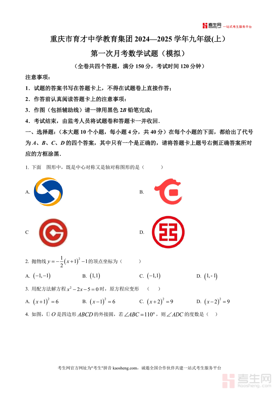 《精品解析:重庆市育才中学教育集团2024-2025学年九年级上学期第一次月考数学试题(模拟)(原卷版).docx》是一份针对九年级上学期数学阶段性考核设计的高质量备考资料,严格遵循重庆市育才中学教育集团月考命题规范,涵盖选择题(10小题40分)、填空题(8小题32分)、解答题(8小题78分)三大题型,总分值150分,考试时长设定为120分钟。资料聚焦九年级上学期核心知识点,包括二次函数顶点坐标求解、圆内接四边形性质、几何变换(旋转)应用、统计概率计算等,题目设置梯度合理,既考查基础概念掌握情况,又注重综合应用能力提升,能精准反映集团校月考命题趋势与难度水平。
