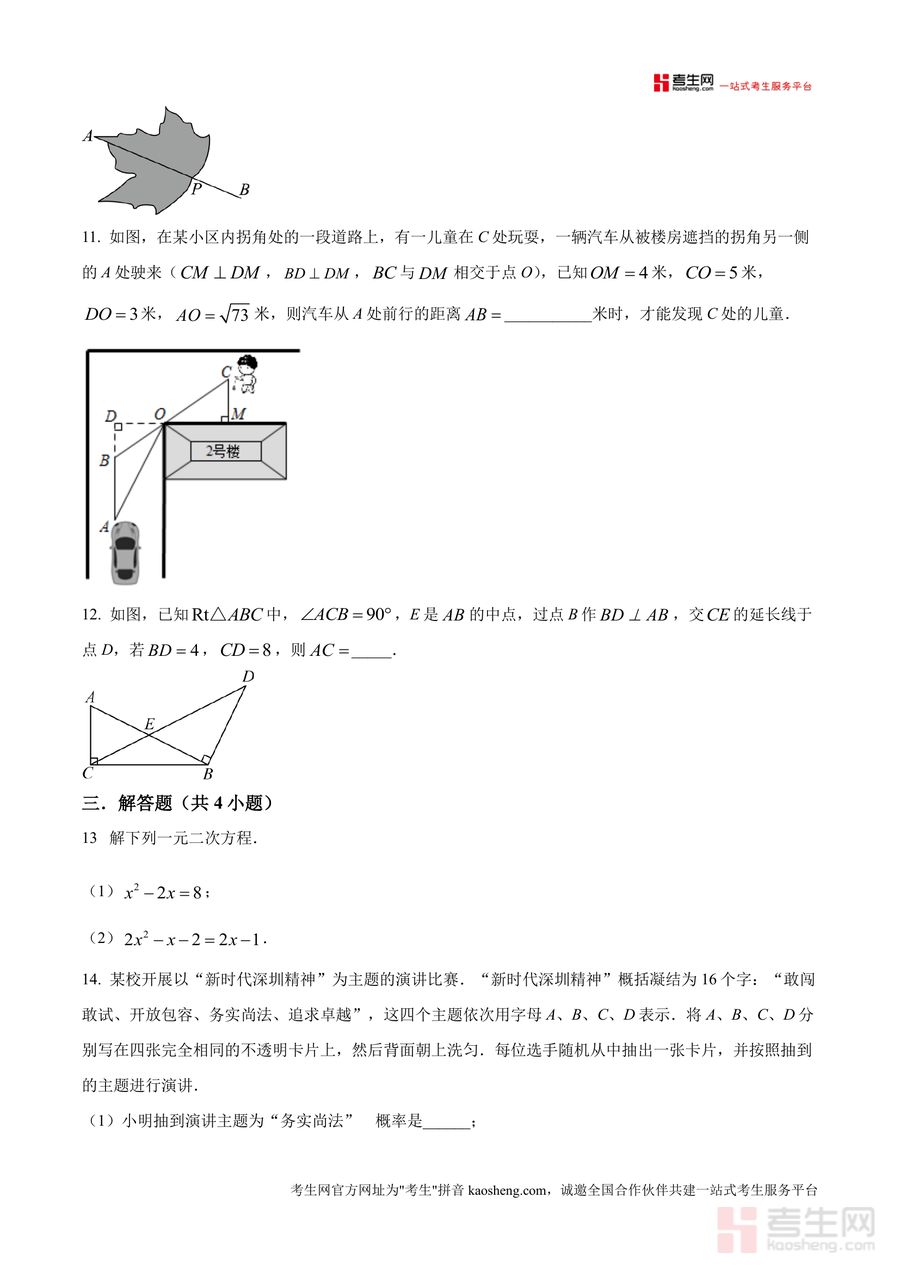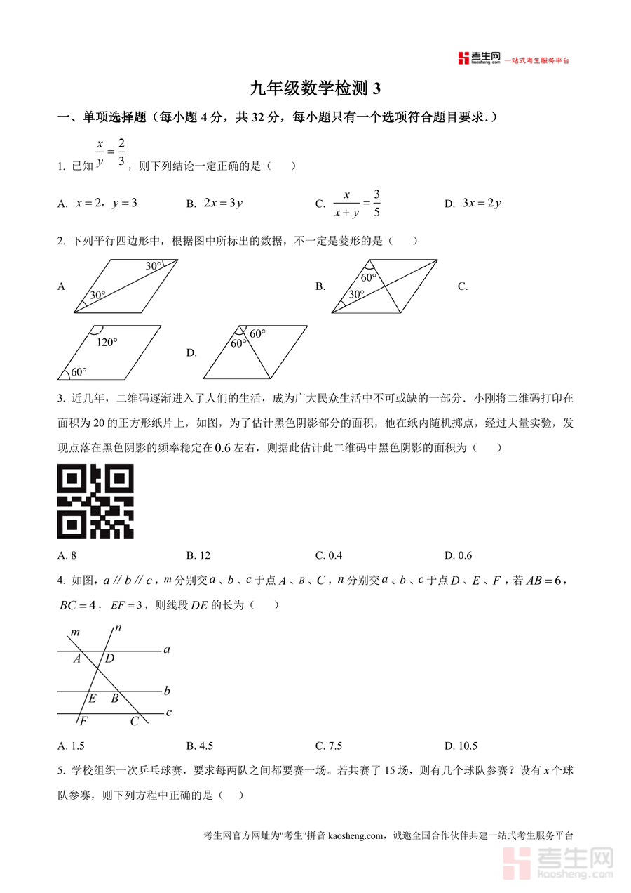 《精品解析:广东省深圳中学光明科学城学校2025--2026学年上学期9月九年级数学试卷(原卷版).docx》是一份针对九年级上学期开学初数学学习情况的精准检测资料,涵盖单项选择、填空及解答三大题型,全面覆盖相似三角形性质、菱形判定与性质、概率计算、一元二次方程求解、图形平移与最值问题等核心知识点。试卷依托深圳中学光明科学城学校优质教学资源编制,题型设置贴合广东省中考数学命题趋势与本地教学进度特点,题目梯度合理——基础题考查核心概念掌握程度(如黄金分割实际应用),中档题侧重知识综合应用(如平行四边形性质证明),难题则聚焦思维能力拓展(如动态几何中PE+PF最值问题)。作为原卷版资料,它完整保留了该校检测试卷的原始结构与命题风格,为使用者提供最真实的练习场景。