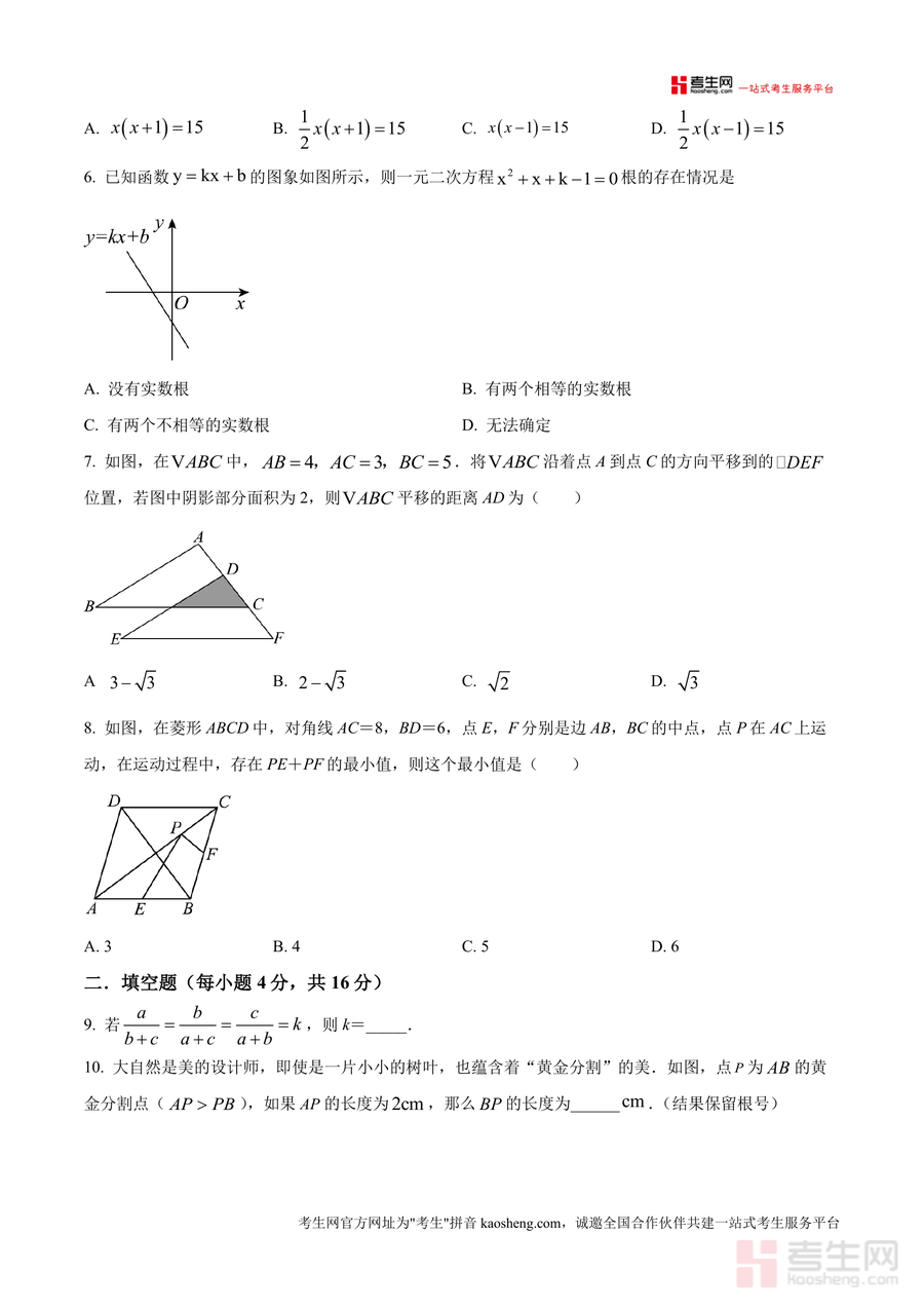 该试卷核心用途在于帮助九年级学生完成开学初的学情自我评估,精准定位知识薄弱环节(如一元二次方程根的判别式应用、概率树状图分析等);同时,教师可将其作为备课参考资源,设计针对性教学方案;家长也能借助试卷了解孩子数学学习状态。使用场景包括学生课后自主练习、班级单元检测模拟及假期复习巩固。其备考优势显著:通过练习该试卷,学生可提前熟悉中考题型结构与分值分布,提升应试能力;真题级别的题目设置能有效训练解题思路,助力形成系统知识框架;结合后续解析版本使用,可进一步深化对考点的理解与解题方法的掌握。