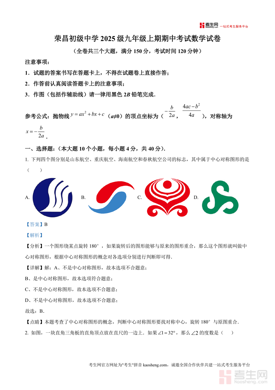 《精品解析:重庆市荣昌初级中学2024-2025学年九年级上学期期中考试数学试卷(解析版)》是一份针对该校九年级上学期期中数学考试的精准真题解析备考资料,包含全卷三大题型(10道选择题、8道填空题、8道解答题)完整题目及逐题深度解析。解析内容覆盖考点定位(如中心对称图形判定、二次函数对称轴计算、圆周角定理应用)、解题思路推导(如因式分解法解一元二次方程步骤、几何图形旋转性质运用)、易错点提示(如分式方程增根检验、不等式组整数解范围确定)等核心模块,同时关联教材知识点进行拓展梳理。