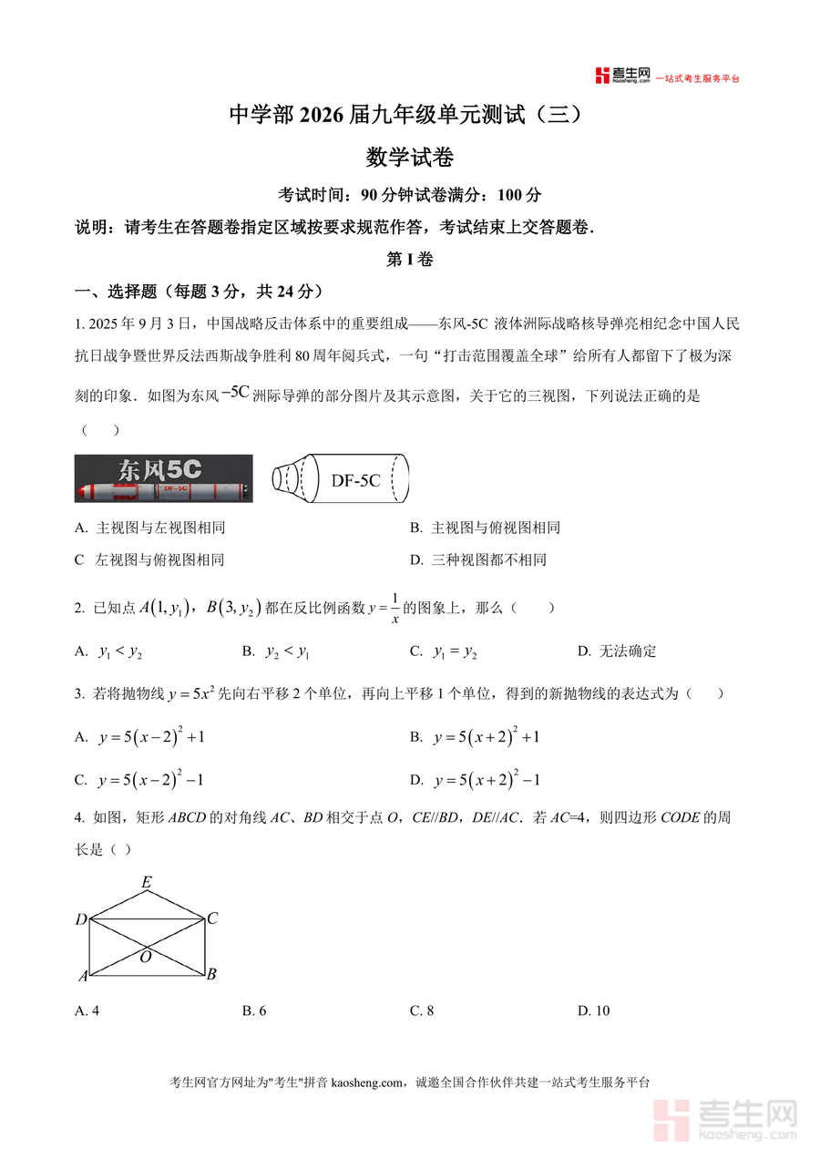 《精品解析:广东省深圳实验学校中学部2025--2026学年上学期九年级数学单元测试试卷(三)(原卷版).docx》是一份针对九年级数学阶段性学习的高质量备考资料,聚焦该学期第三单元核心知识,涵盖三视图判断、反比例函数性质应用、抛物线平移变换、矩形与菱形几何性质、概率统计分析、几何作图及三角函数实际应用等关键内容。试卷严格遵循深圳实验学校中学部教学进度与命题标准,保留原卷题型结构与难度梯度,包含选择题(24分)、填空题(15分)及解答题(61分)三大模块共20道题目,每道题均贴合单元知识点考察要求,为学生提供真实测试场景参考。