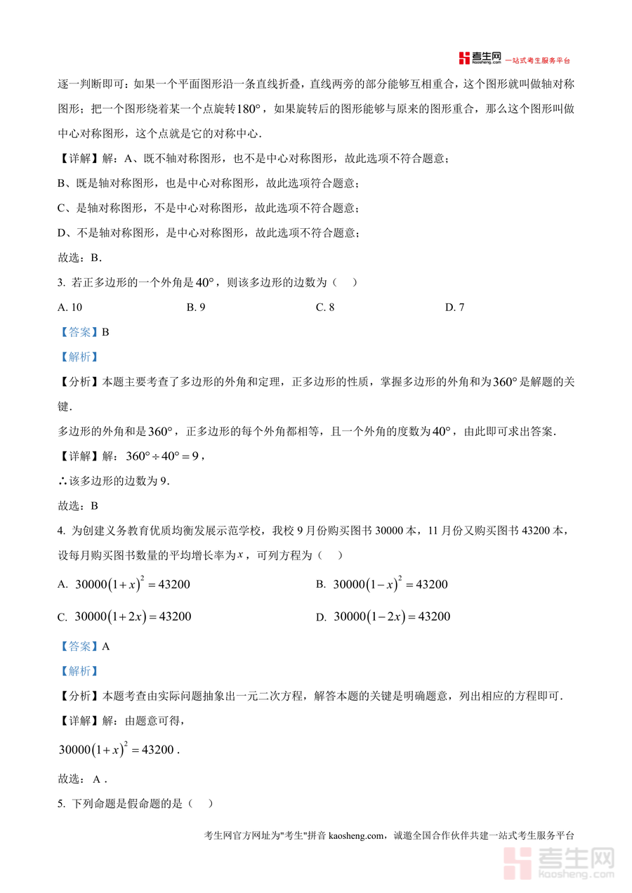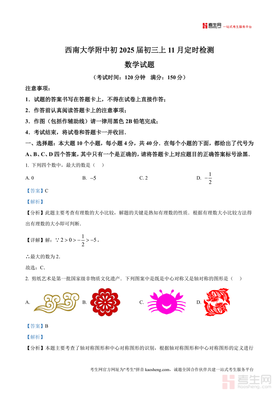 《精品解析:重庆市西南大学附属中学校2024-2025学年九年级上学期11月月考数学试卷(解析版)》是一份针对西南大学附中初三年级上学期11月定时检测数学科目的专业真题解析资料。文件包含完整试卷原题及每道题目的详细解析,覆盖选择题、填空题等主要题型;解析部分不仅明确正确答案,还深入剖析考点(如有理数大小比较、轴对称与中心对称图形识别),拆解解题步骤与思路,标注关键知识点关联,助力学生理解命题逻辑与答题技巧,充分体现了真题解析的专业性与针对性。