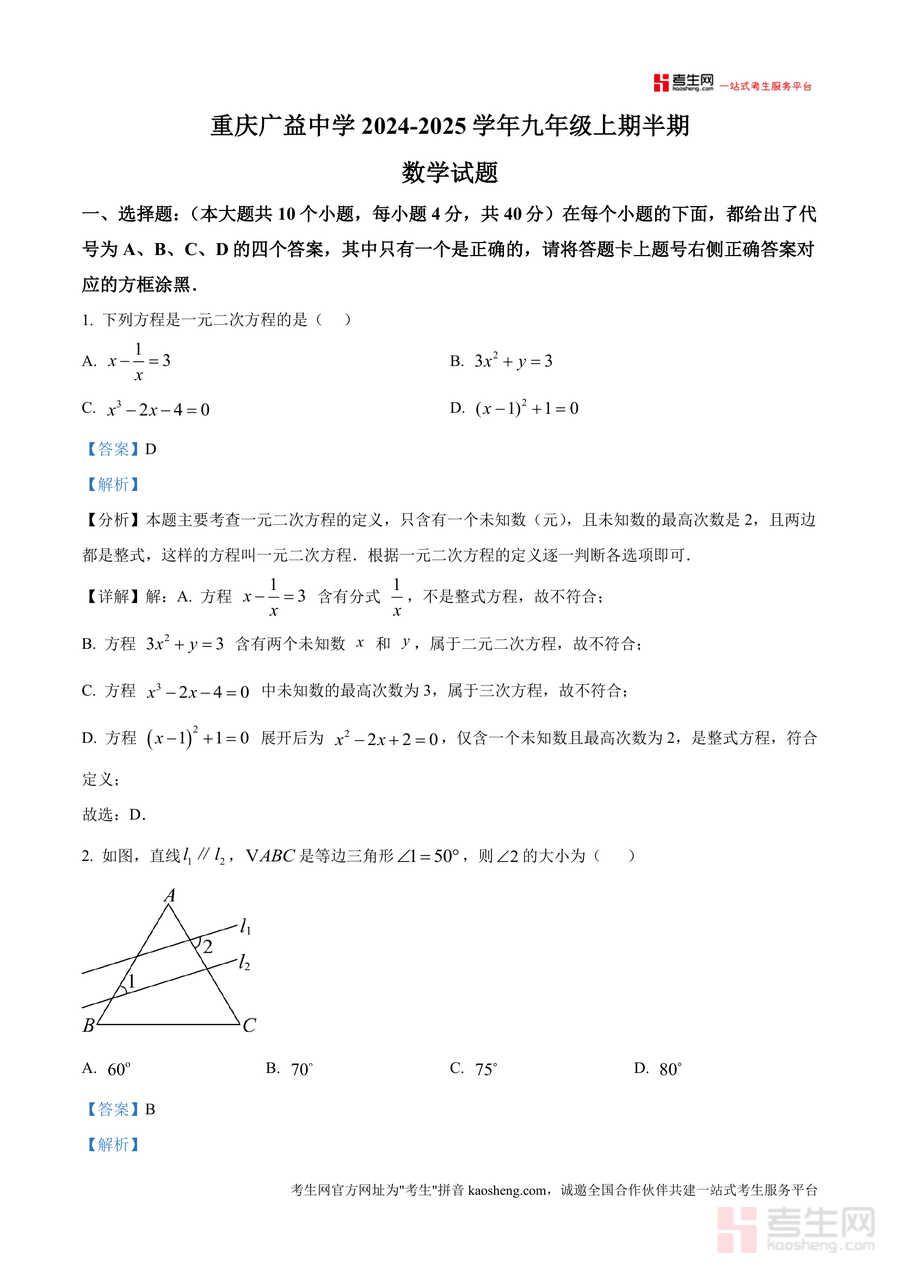 《精品解析:重庆广益中学2024-2025学年上学期九年级半期数学试题(解析版).docx》是一份针对重庆广益中学九年级学生设计的高质量备考资料。该资料包含完整的半期考试数学试题及逐题详细解析,覆盖一元二次方程定义、等边三角形性质、轴对称与中心对称图形判定等核心知识点,同时涉及概率计算、矩形判定定理应用等综合题型。其特色亮点在于每个题目均配备深度解析:不仅给出正确答案,还通过定义解读(如一元二次方程整式性与次数要求)、步骤拆解(如勾股定理结合根与系数关系求解斜边)、易错点提示(如分式方程增根问题)等方式,帮助学生掌握考点本质,而非单纯记忆结论。