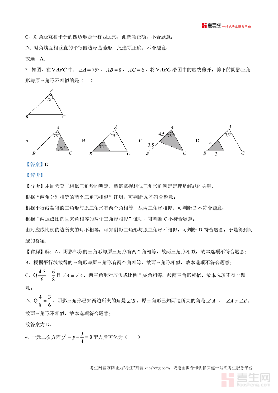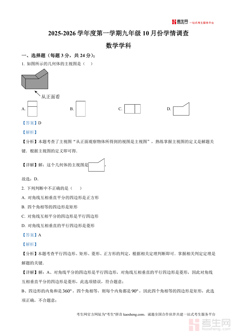 《精品解析:广东省深圳市南山区南山外国语学校(集团)2025-2026学年九年级上学期10月月考数学试卷(解析版).docx》是一份针对九年级数学阶段性学习的精准备考资料,涵盖选择题、填空题、解答题全题型内容,紧密贴合南山区学情调查要求。资料聚焦几何视图、四边形判定、相似三角形、一元二次方程等核心考点,每道题均配备详细分析步骤、考点标注及易错点提示——例如选择题中明确主视图定义的应用逻辑,填空题里根与系数关系的推导过程。特色亮点在于结合本地名校命题趋势,解析深度匹配中考能力要求,帮助使用者快速把握题型规律与解题方法。