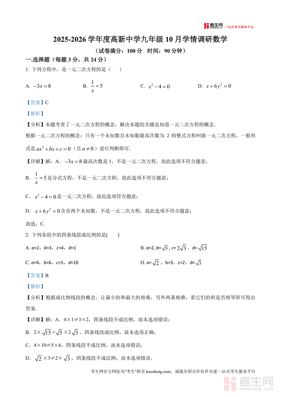 《精品解析:广东省深圳市南山区南山外国语学校(集团)高新中学2025-2026学年九年级上学期10月月考数学试卷(解析版).docx》是一份针对该校九年级学生10月学情调研数学试卷编制的专业配套解析资料,包含完整试卷原题及各题型(选择题8道、填空题5道、解答题7道)对应的详细解析内容。解析紧扣九年级上学期数学核心知识点,如一元二次方程概念与根判别式应用、相似三角形判定与性质、概率计算中的树状图法等,对每道题目的考点来源、解题思路、步骤拆解及易错点提示均做了深度呈现;特色在于结合该校学情设计针对性解析,帮助学生清晰理解考点要求与解题逻辑,避免同类错误重复出现。