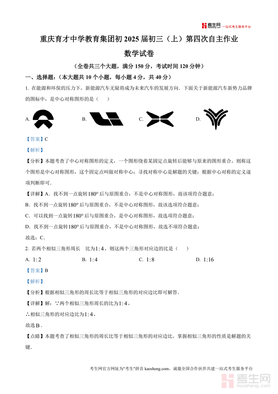 《精品解析:重庆育才中学教育集团2024—2025学年上学期第四次自主作业数学试卷(解析版)》是一份针对初2025届初三学生的高质量数学备考资料,包含全卷三大题(选择题、填空题、解答题)共150分完整题型设置,解析部分覆盖考点分析、解题步骤拆解、易错点提示及方法总结等特色内容。该资料依托重庆育才中学教育集团自主作业资源编写,权威性强,能精准反映本地初中数学教学重点与命题趋势,助力学生深入理解核心知识点如中心对称图形判定、相似三角形性质及二次函数应用等。