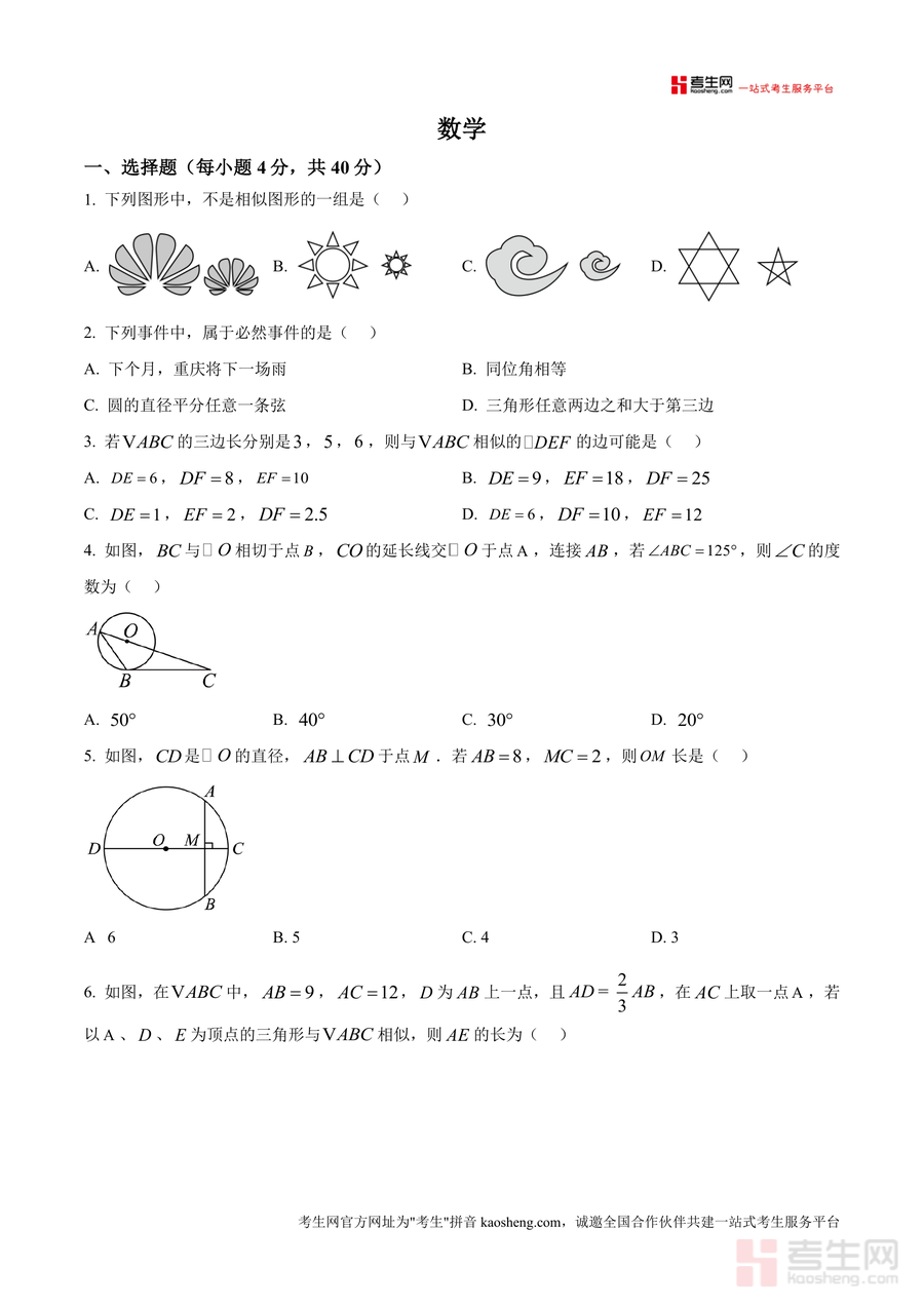 《精品解析:重庆鲁能巴蜀中学2024-2025学年九年级上学期第一次月考数学试题(原卷版).docx》是一份针对重庆重点中学九年级上学期首次月考的数学真题备考资料。该资料包含选择题(10小题共40分)、填空题(8小题共32分)、解答题(8小题共78分)三大题型板块,覆盖相似图形判定、概率统计应用、圆的性质及计算、函数图像分析、几何证明与计算等九年级上册核心知识点。其特色在于严格贴合鲁能巴蜀中学教学进度与命题风格,题目设置兼顾基础巩固与能力提升,能真实还原该校月考的难度梯度与考查重点。