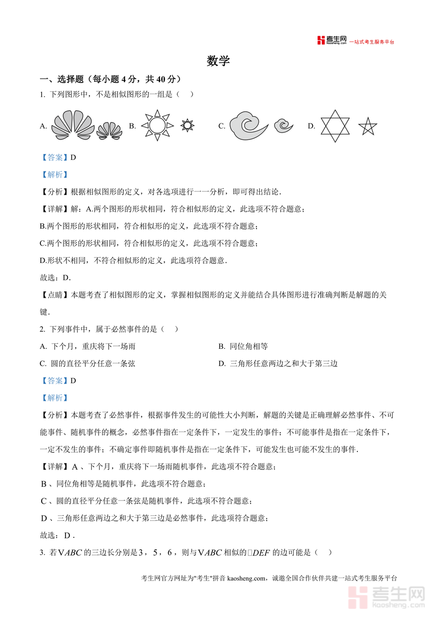 《精品解析:重庆鲁能巴蜀中学2024-2025学年九年级上学期第一次月考数学试题(解析版)》是一份针对该校九年级数学月考真题进行深度剖析的专业教育资料,核心定位为辅助师生精准把握月考命题逻辑与核心考点。主要内容覆盖选择题(10道)、填空题(8道)等典型题型,每道题均包含考点分析(如相似图形定义、必然事件概念)、步骤化详解(如相似三角形三边比例计算、圆切线性质应用)及点睛总结(如垂径定理与勾股定理结合技巧),全面呈现解题思路与易错点提示。特色亮点在于解析紧扣该校教学重点与中考命题趋势,融合基础概念巩固与解题方法拓展,助力学生理解考点本质而非机械记忆。