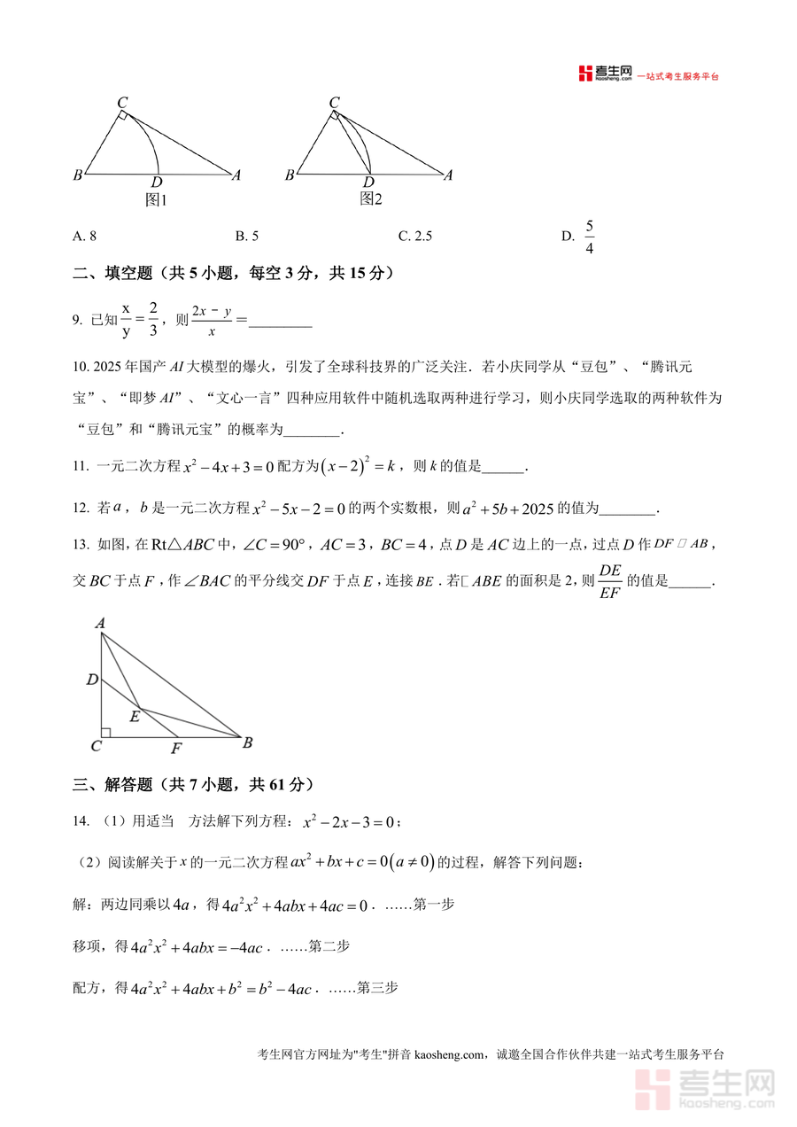 《精品解析:广东省深圳市南山区第二外国语学校(集团)海德学校2025-2026学年上学期10月月考九年级试卷(原卷版).docx》是一份聚焦九年级数学核心知识与能力考查的优质备考资料。试卷包含单项选择、填空、解答三大题型共20道题目,覆盖一元二次方程解法与应用、几何图形(矩形、菱形)性质、概率统计计算、黄金分割原理等九年级上册重点模块;其特色在于贴合深圳南山区名校命题风格,题型设置兼顾基础巩固与能力拓展,如解答题中的尺规作图、实际应用问题及定义新运算题型,能精准反映区域教学重难点与学生能力要求。