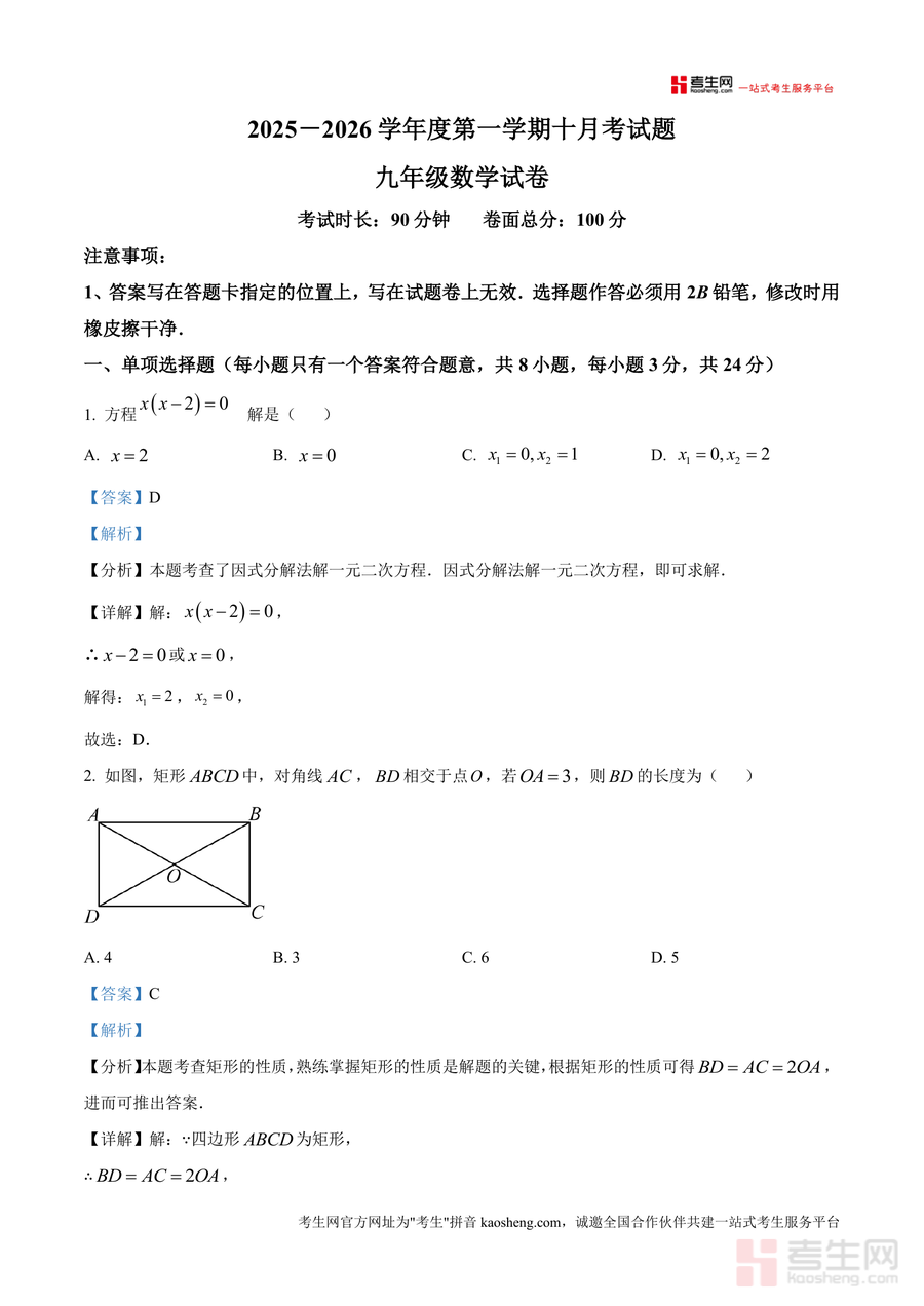 《精品解析:广东省深圳市南山区第二外国语学校(集团)海德学校2025-2026学年上学期10月月考九年级试卷(解析版).docx》是一份针对该校九年级数学月考真题打造专业备考资料。该资料覆盖全卷所有题型(单项选择8题、填空5题、解答题7题),每道题均标注核心考点(如因式分解法解一元二次方程、矩形性质、平行线分线段成比例定理等),并附带解题思路推导与方法总结。其特色在于紧密结合该校教学进度与本地考情,将基础知识点与综合应用能力训练相融合,帮助学生精准把握命题方向。