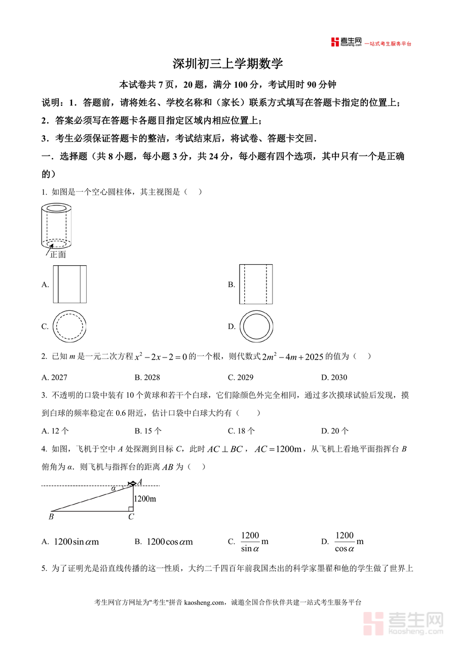 《精品解析:广东省深圳市南山区蛇口学校2024-2025学年九年级上学期第二次月考数学试卷(原卷版).docx》是一份针对深圳南山区蛇口学校初三上学期数学教学进度设计的高质量月考真题资料。该试卷共7页20题,满分100分且考试用时90分钟,题型涵盖选择题(8小题共24分)、填空题(5小题共15分)及解答题(7小题共61分),内容贴合深圳本地初中数学核心考点,如几何图形三视图、一元二次方程应用、概率统计计算、三角函数实际应用等,能精准反映该校阶段性教学重点与命题风格。