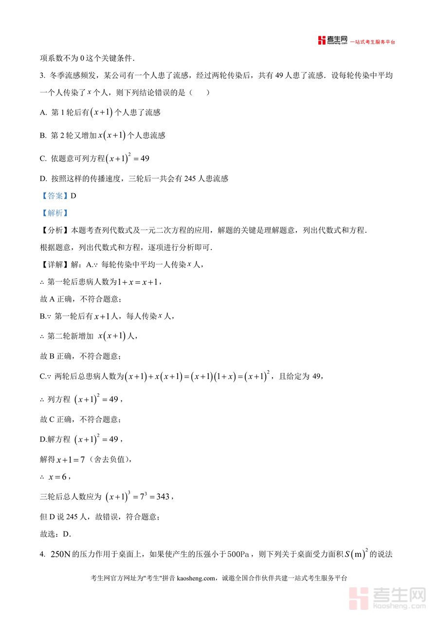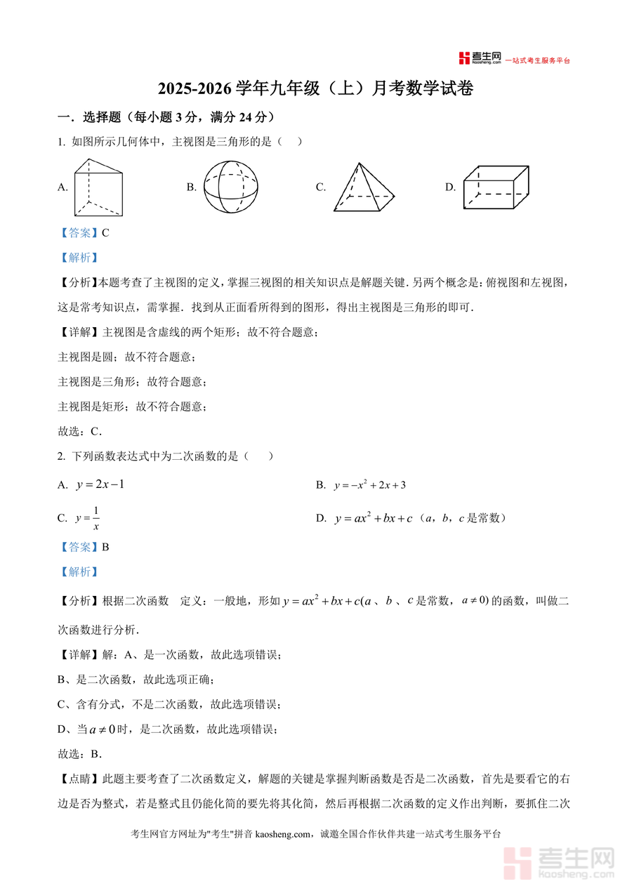 《精品解析:广东省深圳市南山外国语学校(集团)2025-2026学年九年级上学期月考数学试卷(12月份)(解析版).docx》是一份针对深圳本地名校九年级数学阶段性检测的专业备考资料,包含完整试卷原题及逐题详细解析。内容覆盖九年级上学期核心模块:几何部分涉及三视图识别、黄金分割应用、位似变换性质及解直角三角形的仰角俯角问题;代数部分包含二次函数定义判断、一元二次方程求解与实际应用;还涉及统计概率中的条形统计图与扇形统计图综合分析。其特色亮点在于每道题均配备"考点分析""详细解答"及"解题点睛",如选择题第3题通过流感传播模型解析一元二次方程实际应用,不仅给出方程推导过程,还总结传播问题通用思路;填空题第13题针对等腰与等边三角形综合题型分情况讨论,帮助学生构建完整知识体系。