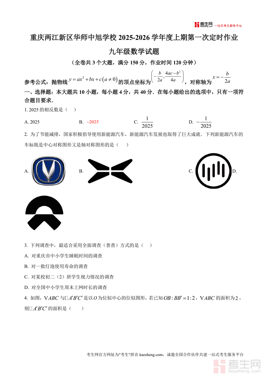 《精品解析:重庆两江新区华师中旭学校2025-2026学年九年级上学期第一次定时作业数学试题(原卷版).docx》是一份针对九年级学生数学学科阶段性学习成果检测的高质量备考资料。该试题包含选择题(10小题)、填空题(6小题)及解答题(9小题)三大题型结构,覆盖相反数概念、图形对称性判断、调查方式选择、位似图形性质等核心知识点,并结合新能源汽车车标设计、"双11"销售额增长等实际场景命题。其特色亮点在于严格遵循重庆本地教学大纲要求,题型设置梯度合理且贴合中考命题趋势,能有效检验学生对九年级上册数学知识框架掌握程度,为后续学习提供清晰指引。