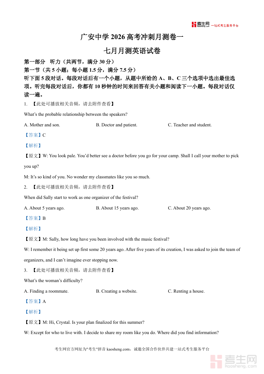 《精品解析:2026届四川省广安中学高三上学期模拟预测(一)英语试题(解析版)》是一份针对高三学生英语备考的高质量专项资料,核心定位为贴合四川高考英语命题趋势的模拟训练与深度解析资源。其主要内容涵盖听力、阅读等高考核心题型(本次展示听力部分包含两节共20小题,覆盖日常对话、长对话及独白等典型场景),每道题均配备完整原文、准确答案及详尽解析。特色亮点在于解析过程不仅明确答案依据,还融入听力技巧点拨(如如何捕捉关键时间信息、推断人物关系等),帮助学生掌握解题逻辑而非单纯记忆答案。