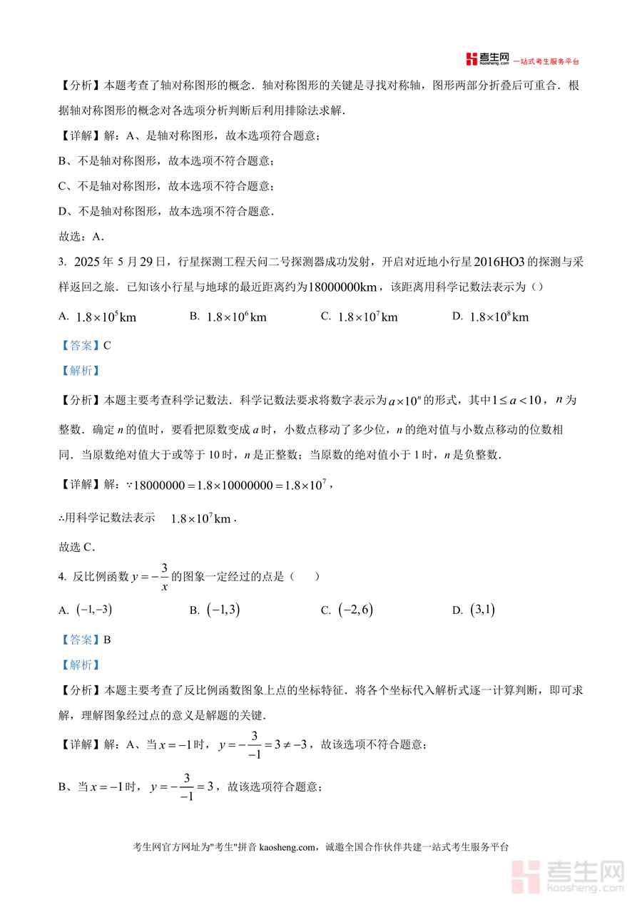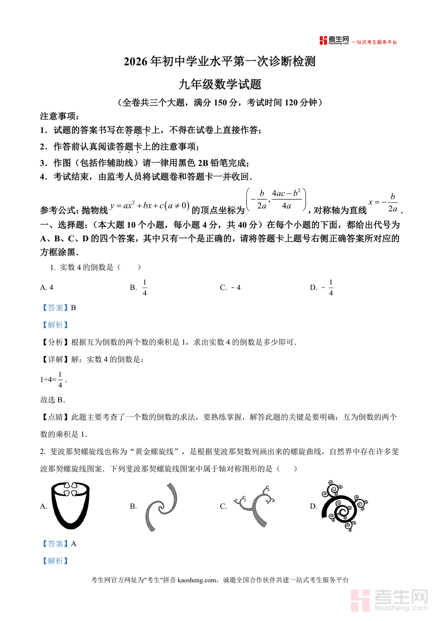 《精品解析:2026年初中学业水平第一次诊断检测九年级数学试题(解析版).docx》是一份针对2026年初中学业水平第一次诊断检测设计核心定位的九年级数学试题深度解析资料,主要内容覆盖选择(10题)、填空(6题)、解答(9题)三大题型共25道题目,包含实数运算(如倒数概念)、轴对称图形识别、科学记数法应用、反比例函数性质等高频考点。其特色亮点在于每道题配备详细分析、步骤详解及点睛提示:选择题中对倒数定义和轴对称图形判定方法精准梳理,填空题融入因式分解法解一元二次方程技巧,解答题结合相似三角形判定与性质等知识展开深度解析,助力学生理解解题逻辑。