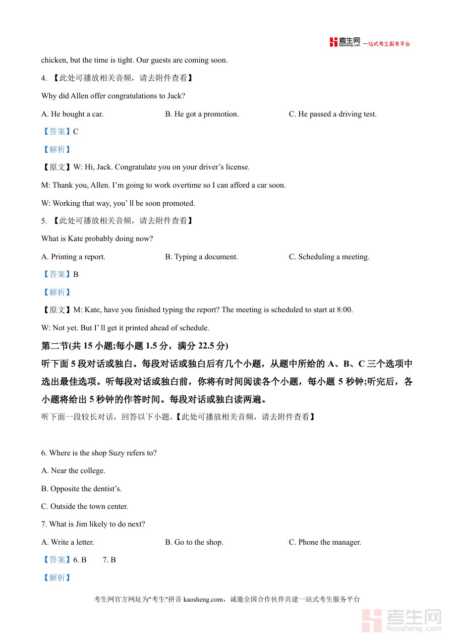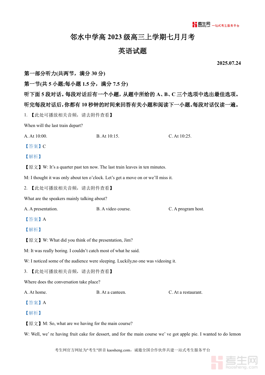 该资料核心用途为辅助学生提升英语应试能力,尤其是听力专项的解题技巧与场景理解能力。使用场景包括高三学生日常听力训练后的错题复盘、教师课堂讲解的参考资料、家庭备考中的针对性练习;用户价值体现在通过逐题解析让学生掌握听力题的核心考点如时间计算、场景判断、主旨归纳等,形成系统解题思路;备考优势在于试题的时效性(2025年7月最新模拟)和本地化命题特色,能帮助学生提前适应高三阶段的考试节奏与难度,有效弥补听力薄弱环节。