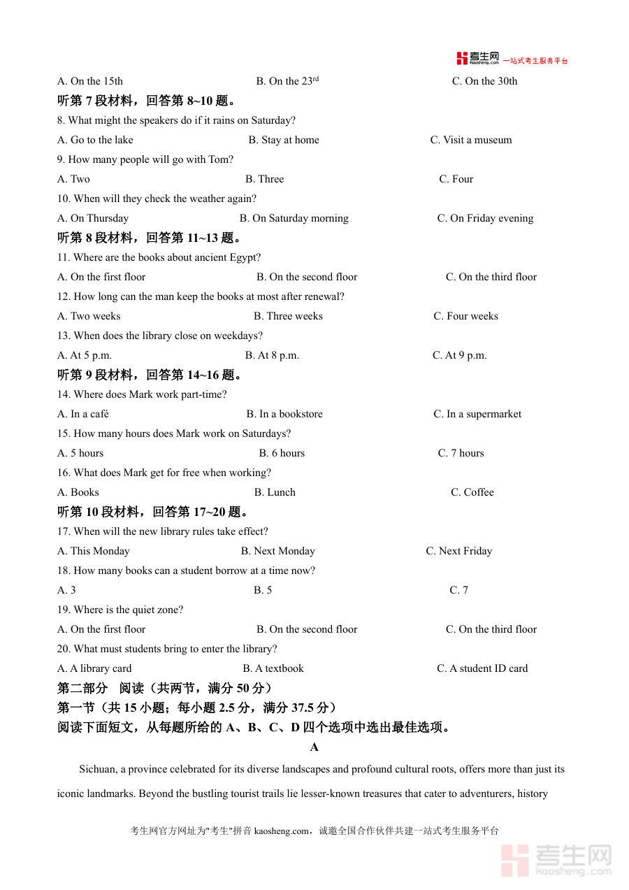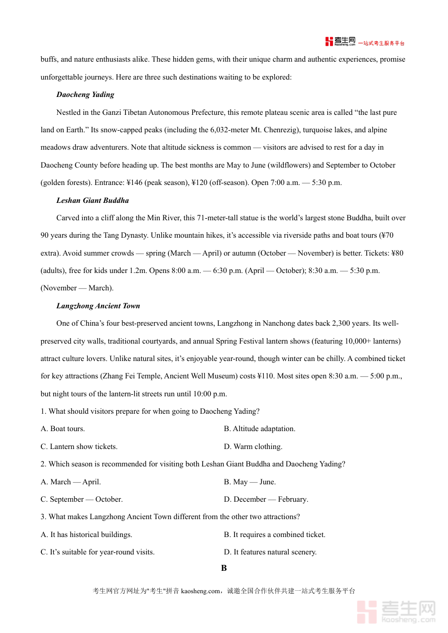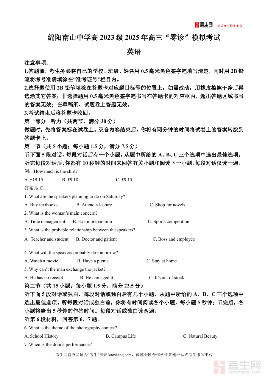 《精品解析:2026届四川省绵阳南山中学高三“零诊”模拟考试英语试题(原卷版)》是一份针对四川省顶尖高中绵阳南山中学2026届高三学生设计的标准化诊断模拟试卷,严格遵循最新高考英语大纲及地方考试要求,涵盖听力、阅读等核心题型(如听力部分含两节共20小题,阅读部分包含多篇短文理解)。该试卷的特色亮点在于其题目设计贴近真实高考场景,题型分布与难度梯度契合该校教学进度及省级考试趋势,同时融入了具有地域文化特色的阅读素材(如涉及四川本地景点的短文),为使用者提供兼具权威性与实用性的备考资源。