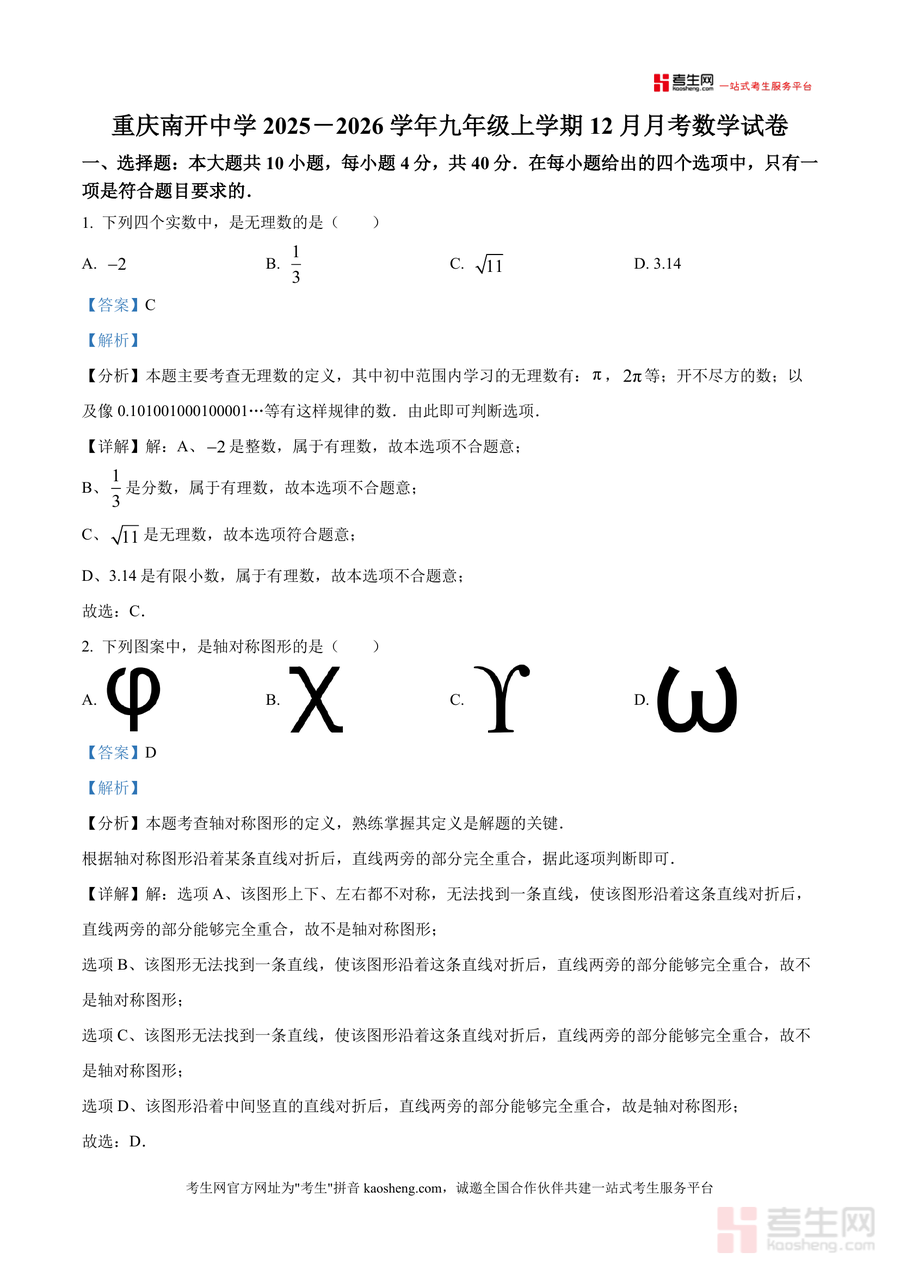 《精品解析:重庆南开中学2025-2026学年九年级上学期12月月考数学试卷(解析版)》是一份聚焦九年级数学核心考点 的权威真题解析资料,包含10道选择题、6道填空题等典型题型及完整解析内容,特色亮点在于结合南开中学命题导向,每道题均配备考点溯源、思路拆解与规范解答,同时融入易错点提醒与方法总结,助力学生精准理解知识应用场景。