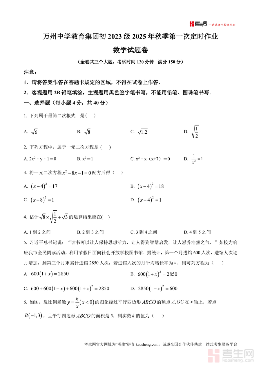 本试题卷适用于万州中学教育集团及同类学校九年级学生、初中数学教师及关注孩子数学学习的家长。作为九年级上学期首次定时作业,它的必要性在于真实反映开学初期知识掌握情况;不可替代性体现在紧密结合集团教学特色与本地命题趋势;长期价值则是作为后续复习时回顾基础、强化综合能力的重要资料,助力学生系统性提升数学素养与应试水平,为中考成功筑牢根基。