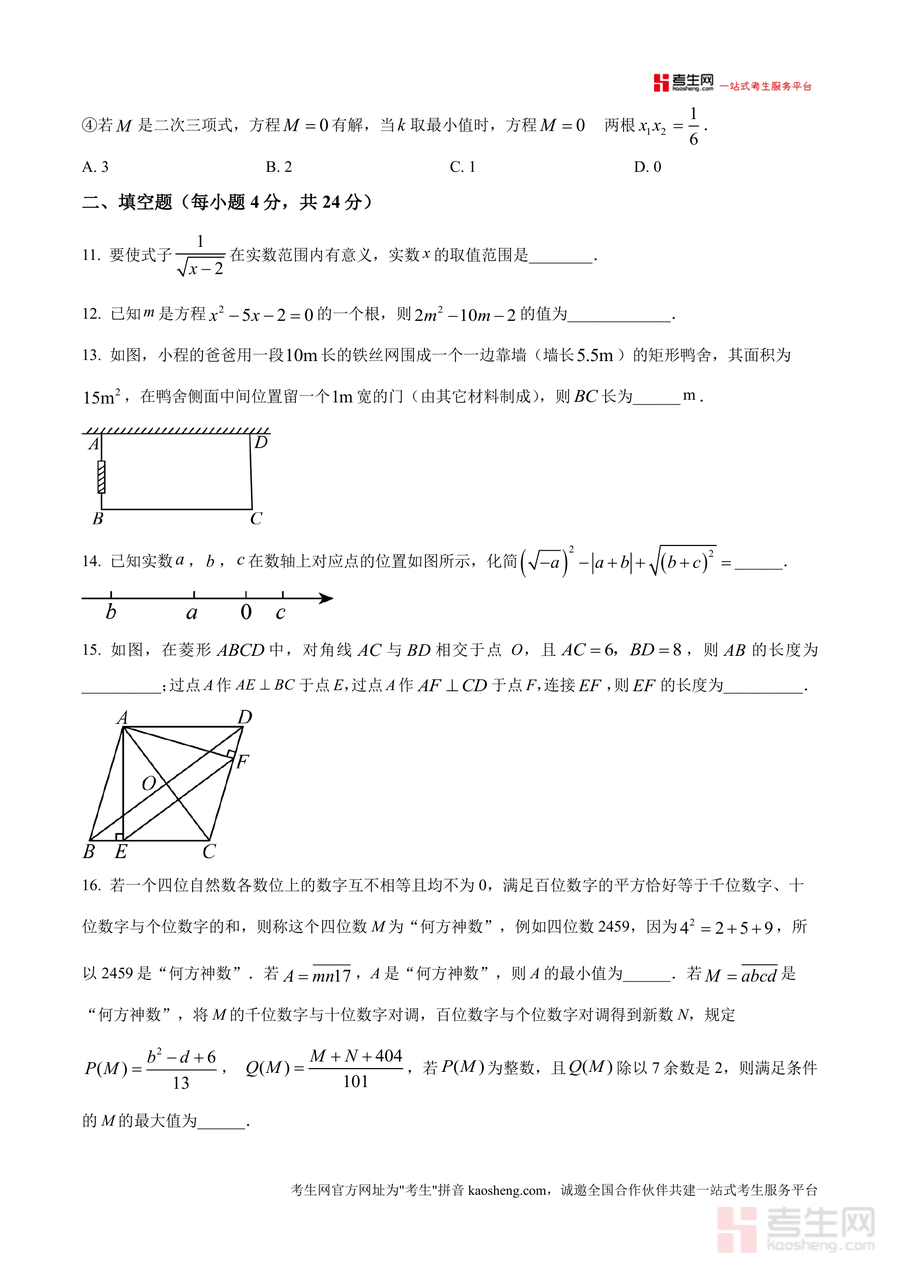 《精品解析:重庆市万州中学教育集团2025-2026学年上学期九年级第一次定时作业数学试题卷(原卷版).docx》是一份服务于九年级学生数学阶段性测评的优质备考资料。该试题卷严格对标重庆万州中学教育集团教学大纲与中考考纲要求,覆盖二次根式、一元二次方程、反比例函数、几何图形(矩形、菱形、正方形等)、统计分析及实际应用等核心知识模块。全卷设三个大题共25道小题,其中选择题40分、填空题24分、解答题86分,考试时长120分钟、满分150分。其特色在于兼顾基础考查与能力提升:基础题聚焦核心概念与技能(如最简二次根式判断、一元二次方程配方等),综合题则融入新定义(如“何方神数”)、几何变换(翻折、旋转)等复杂情境,能全面检测学生初期学习成效。