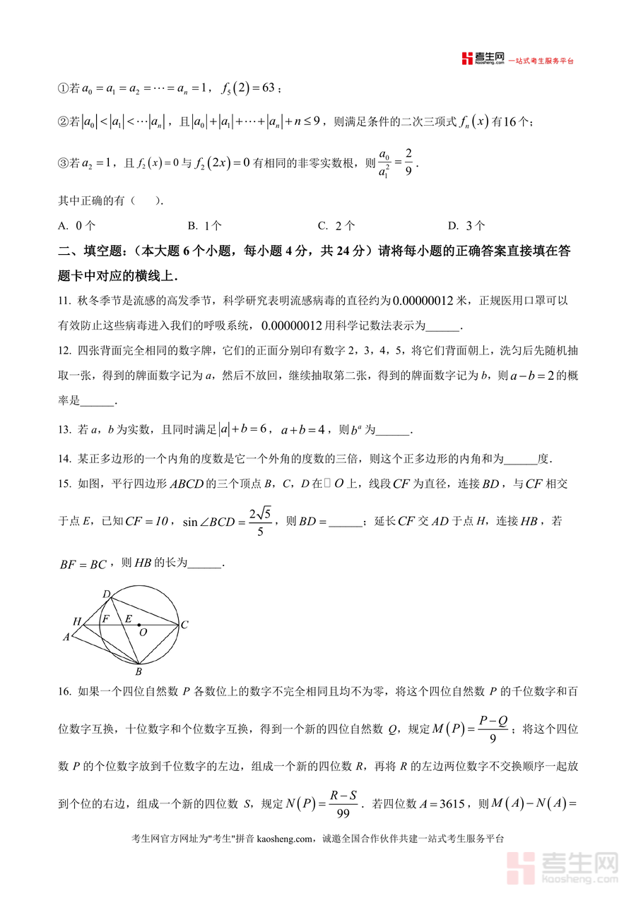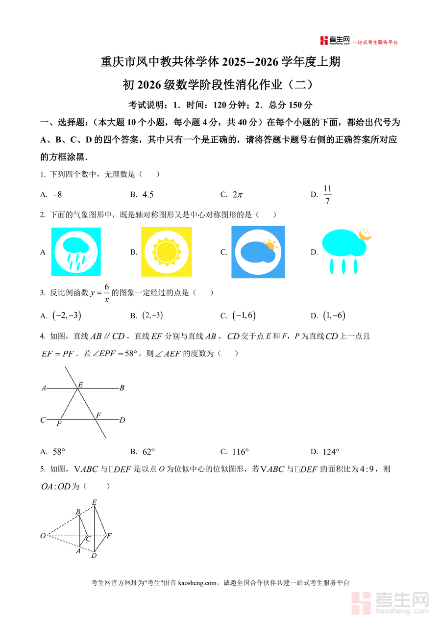 适用人群为重庆市凤鸣山中学教共体及重庆地区同类学校九年级学生、数学教师及中考备考指导者;作为阶段性消化作业,它是巩固知识提升解题能力必要工具——其教共体联合命题背景确保试题针对性与权威性,不可替代;长期来看,该试题能帮助学生构建完整九年级数学知识体系,为后续中考冲刺奠定坚实基础,具有持续指导备考实践价值。