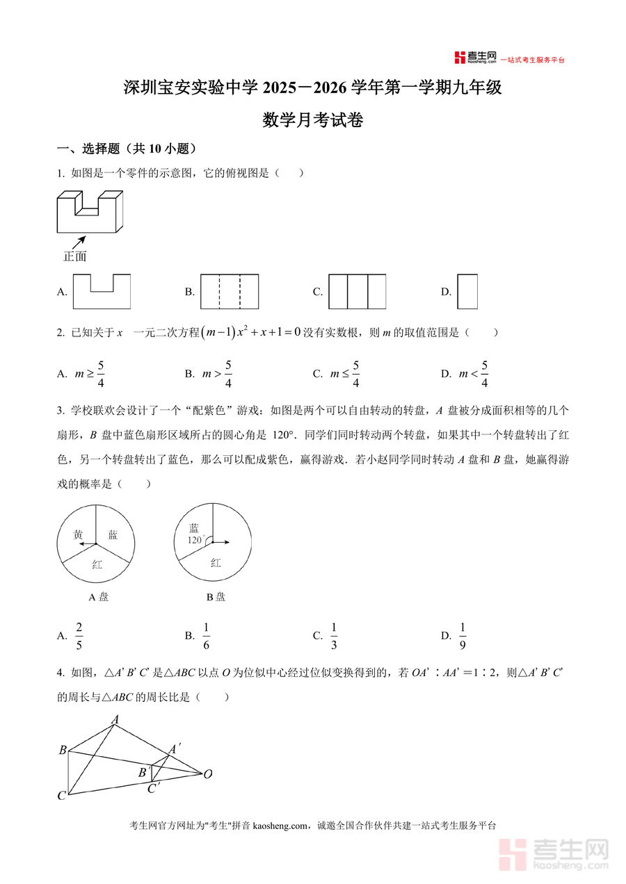 《精品解析:广东省深圳市宝安区实验学校2025-2026学年上学期九年级数学月考卷(原卷版).docx》是一份针对深圳市宝安区实验学校九年级学生设计的阶段性数学备考资料,聚焦九年级上册核心知识点与该校教学进度。资料包含选择题、填空题、解答题三大题型共20道题目,覆盖视图与投影、一元二次方程根判别式、概率计算、位似变换比例关系、反比例函数性质、几何图形性质证明、三角函数实际应用、统计数据分析及几何变换综合应用等关键内容。其特色在于贴合该校命题风格,题型设置兼具基础性与综合性,能精准反映学生对阶段知识的掌握程度,为后续复习提供明确方向。
