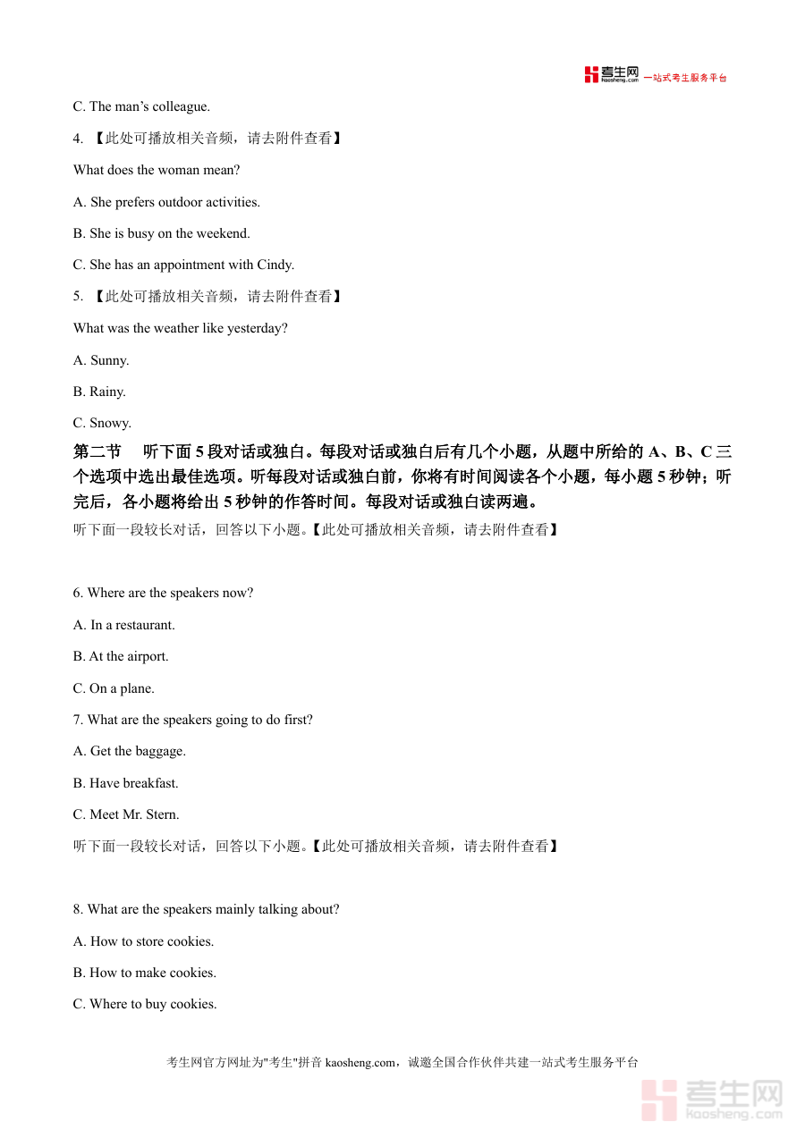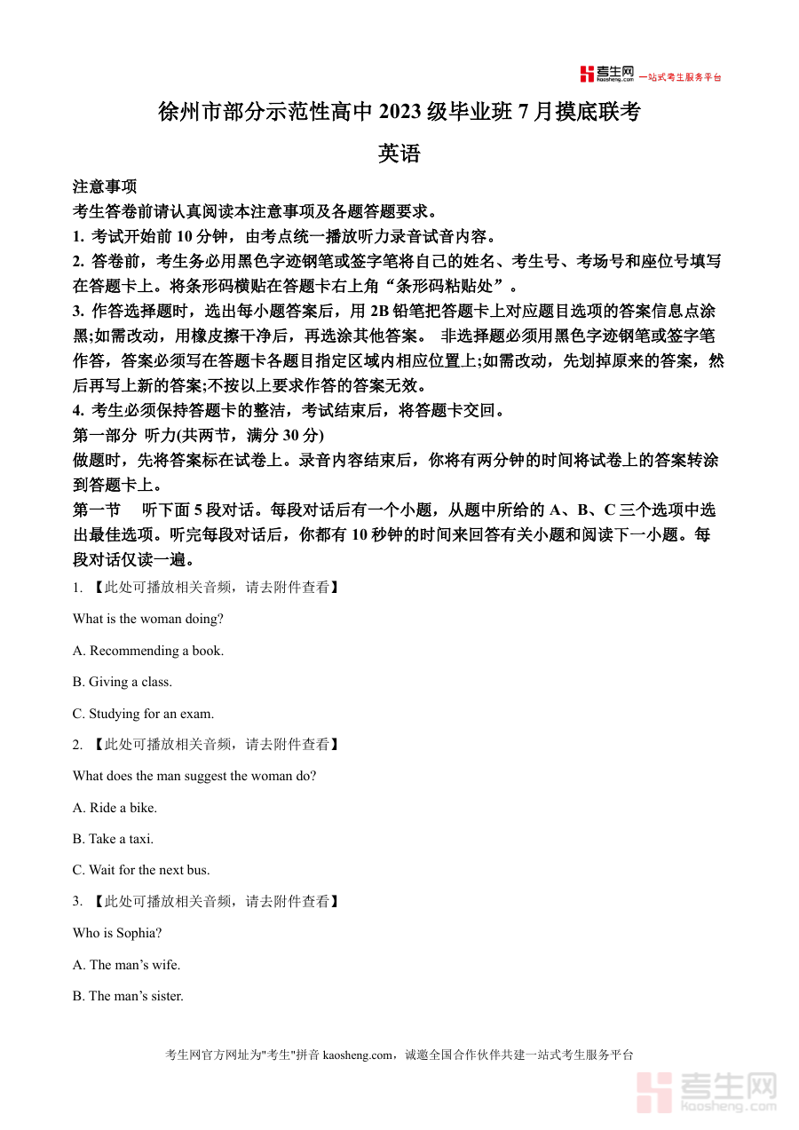 《精品解析:2026届江苏省徐州市部分示范性高中高三上学期7月摸底考试英语试题(原卷版)docx》是一份聚焦2026届高三学生首轮备考需求的区域性联考真题资料,完整收录了本次摸底考试的全部试题内容,涵盖听力(两节共20小题)、阅读(第一节5篇短文)等高考核心题型模块,严格遵循《普通高中英语课程标准》及江苏省高考英语命题导向,保留了原卷的试题排版、答题规范及注意事项细节(如听力试音要求、答题卡填写说明等),为使用者提供高度仿真的考试场景与命题视角。