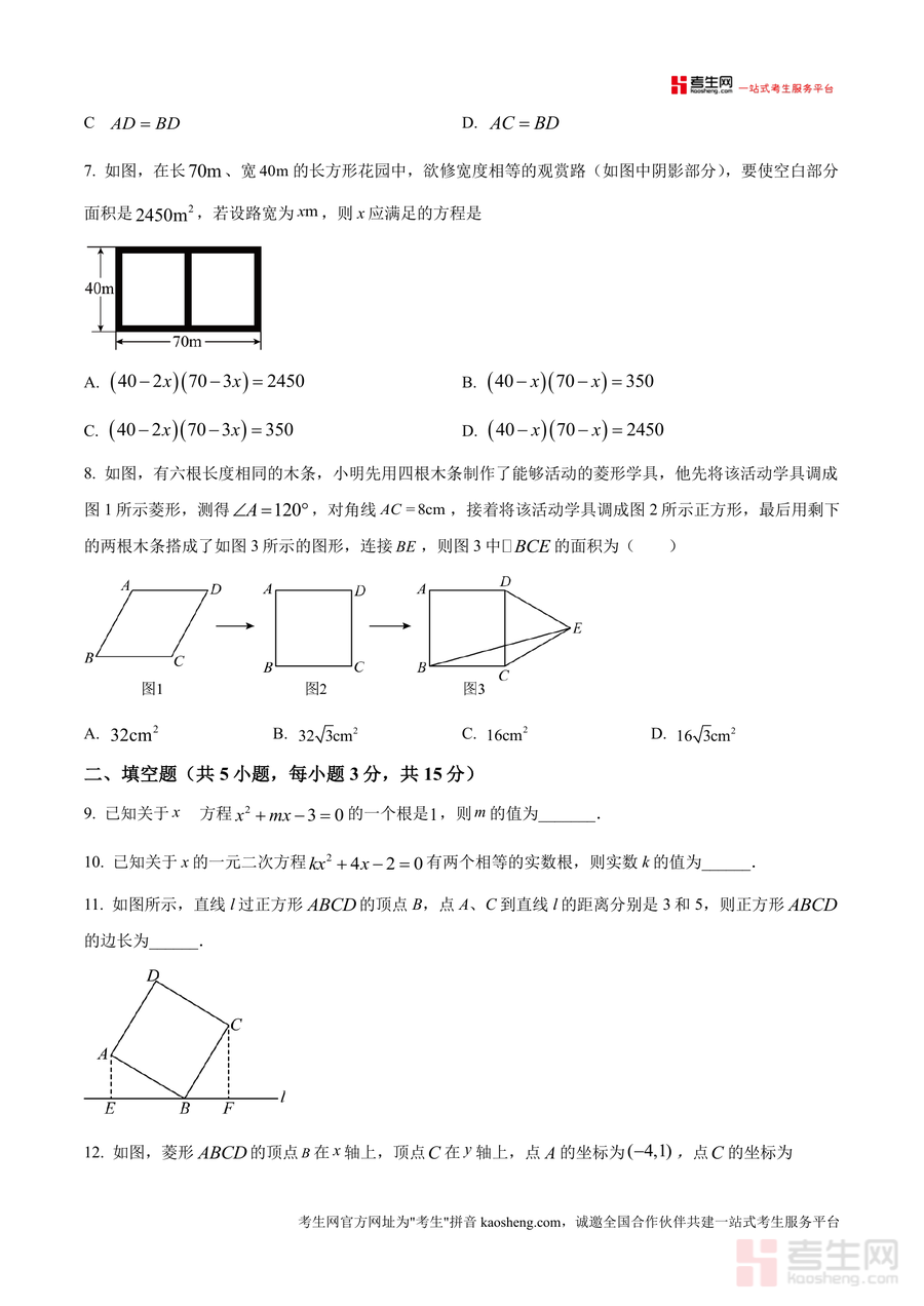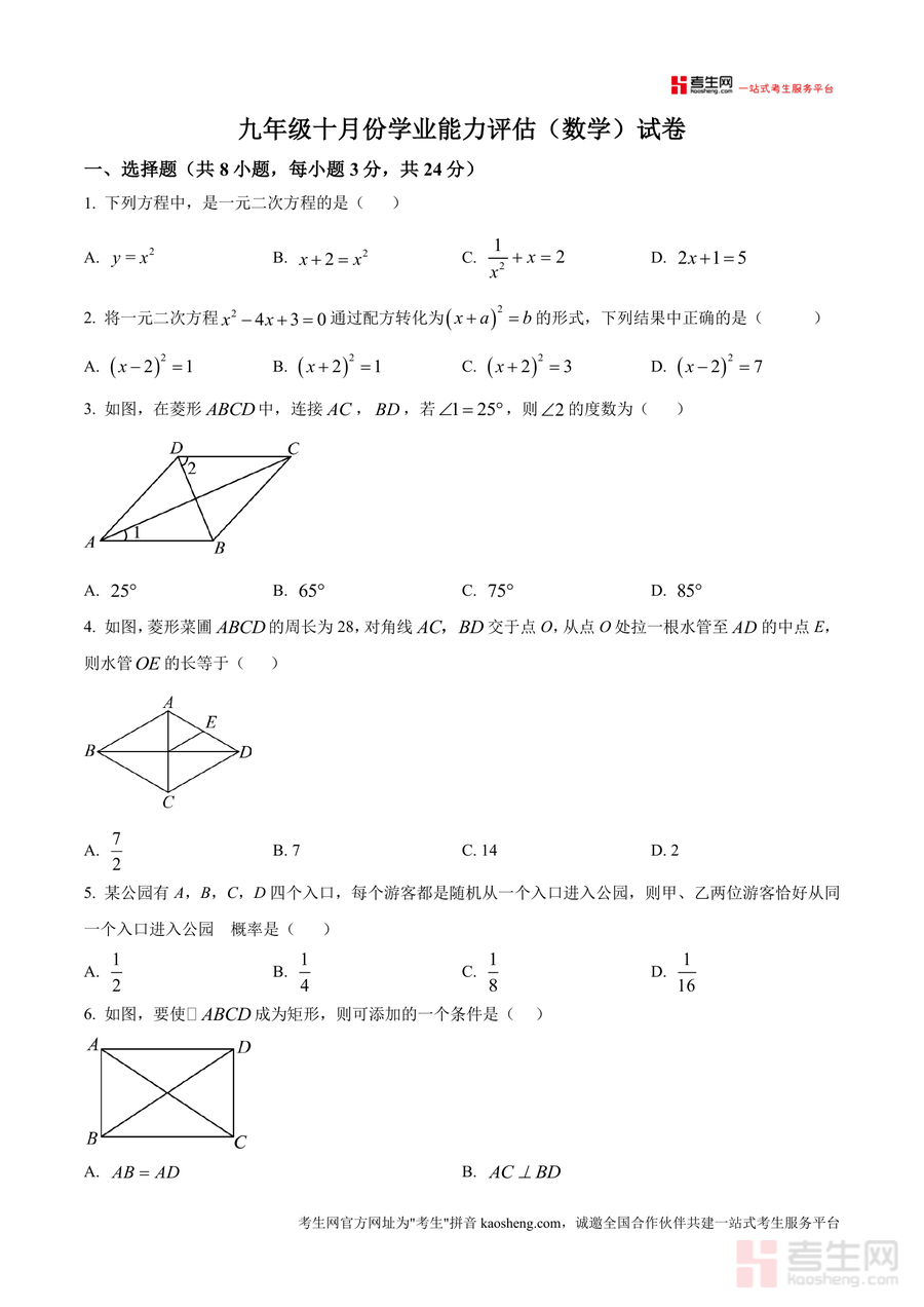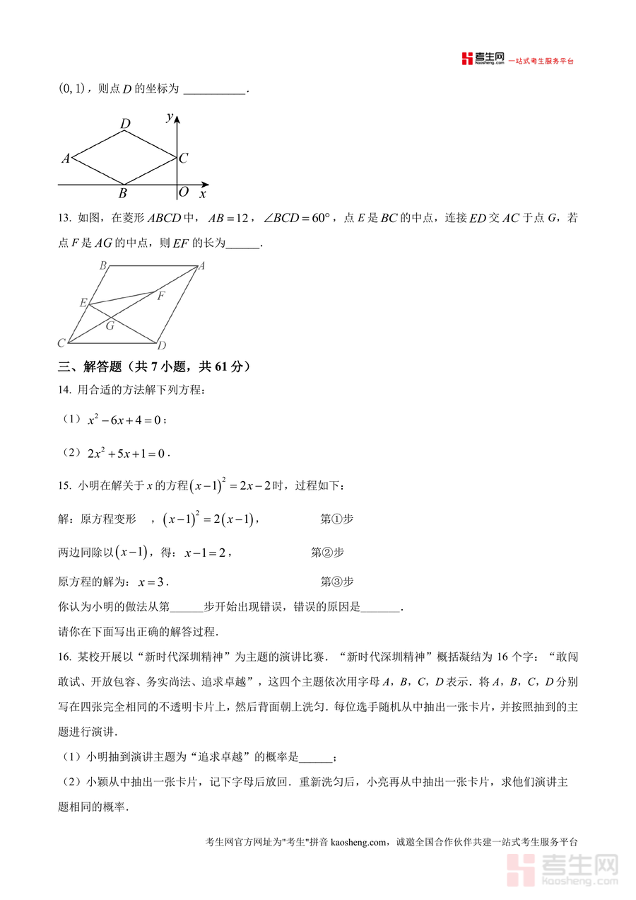 《精品解析:广东省深圳市宝安区富源学校2025-2026学年九年级上学期9月月考数学试卷(原卷版)》是一份针对九年级数学阶段性学习评估的高质量备考资料,聚焦深圳宝安区富源学校的教学进度与本地中考命题趋势。试卷涵盖选择题、填空题、解答题三大题型共20道题目,内容涉及一元二次方程解法与应用、菱形及矩形的几何性质、概率计算、图形折叠综合等核心知识点。其中“差积方程”定义题、菱形与正方形转化的实践题等特色题型,能有效考查学生的逻辑思维与知识迁移能力。