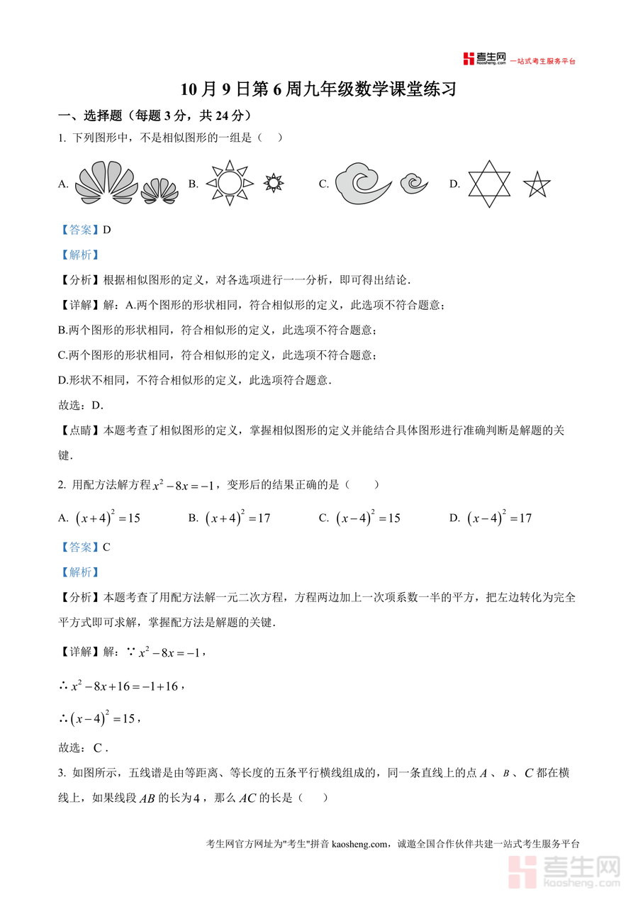 《精品解析:广东省深圳市宝安区海韵学校2025-2026学年九年级上学期第一次月考数学试卷(解析版).docx》是一份针对九年级上学期第一次月考的本地化数学真题解析资料,涵盖选择题(8道)、填空题(5道)及解答题(7道)三大题型,覆盖相似图形判定、配方法解一元二次方程、平行线分线段成比例、根判别式应用、相似三角形实际场景应用等核心知识点。其特色亮点在于每道题均配备完整解析体系:包含题干分析、详细解答步骤及点睛总结,不仅明确答案来源,更深入拆解解题思路与关键技巧,如相似图形定义精准应用、配方法规范步骤等,助力学生掌握知识本质而非机械记忆。
