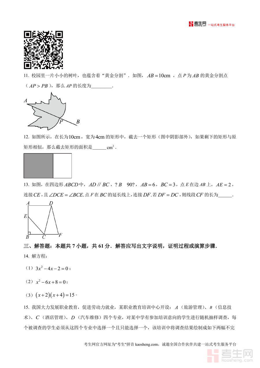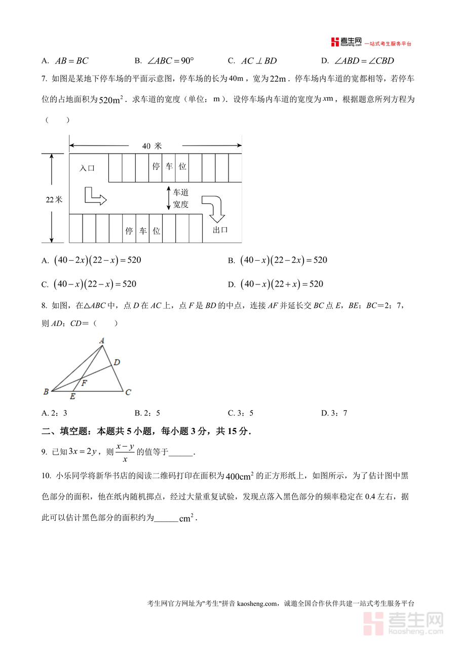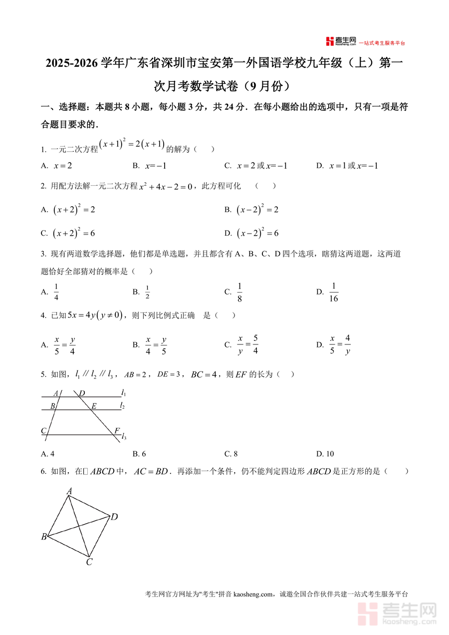 《精品解析:广东省深圳市宝安区第一外国语学校2025-2026学年九年级上学期第一次月考数学试卷(9月份)(原卷版).docx》是一份针对宝安区第一外国语学校九年级上学期首次月考设计的数学原卷资料。该试卷包含8道选择题、5道填空题及7道解答题三大题型模块,覆盖一元二次方程解法与应用、概率计算、相似三角形性质、特殊四边形判定等九年级上册核心知识点;其题型设置贴合深圳中考考纲要求,且严格遵循该校月考命题规律与难度梯度分布,能真实还原考试场景与知识考察方向。