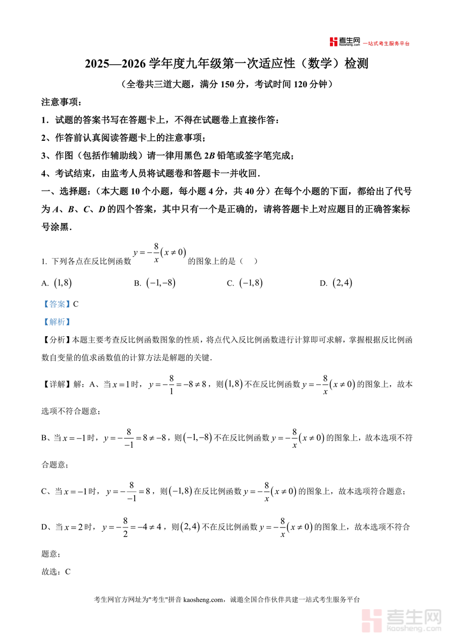 《精品解析:重庆市大渡口区2025-2026学年九年级上学期第一次适应性考试数学试卷(解析版)》是一份针对该区域九年级学生首次适应性考试设计专业真题解析备考资料。资料涵盖全卷三大题(选择题10道、填空题6道、解答题9道)共25道题目,每道题均配备深度解析——包含考点定位(如第1题涉及反比例函数图象性质考点)、解题步骤拆解(如第8题通过矩形面积公式建立一元二次方程模型)、易错点警示(如第5题区分特殊四边形对角线性质差异)及方法总结(如第7题图形规律探索递推公式应用)。其特色在于解析紧密贴合本地考纲要求,并融入“考点关联+思维拓展”模块,例如在相似三角形题目中链接初中阶段相似判定定理体系,帮助学生构建知识网络。