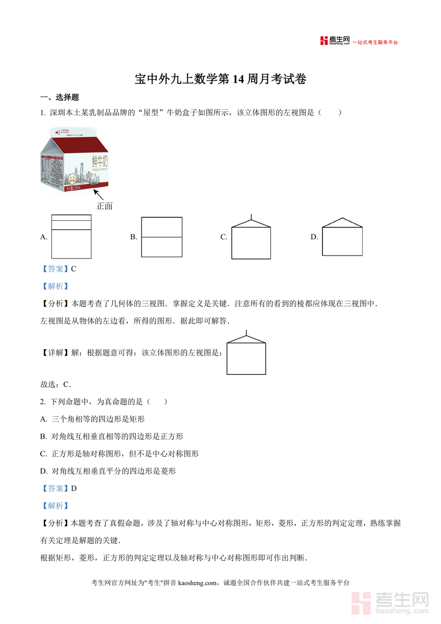 《精品解析:广东省深圳市宝安第一外国语学校2025-2026学年上学期九年级数学月考卷(解析版).docx》是一份针对九年级数学阶段性检测设计的高质量备考资料,聚焦宝安区第一外国语学校第14周月考真题展开深度解析。内容覆盖选择题、填空题、解答题三大题型共17道题目,涵盖几何体三视图、矩形菱形正方形判定、反比例函数图像性质、相似三角形应用等九年级核心知识点。特色亮点在于每道题均配备详细"分析-详解-点睛"三层结构,不仅给出正确答案,更拆解解题思路、梳理考点关联,帮助学生掌握同类题型的解题方法。