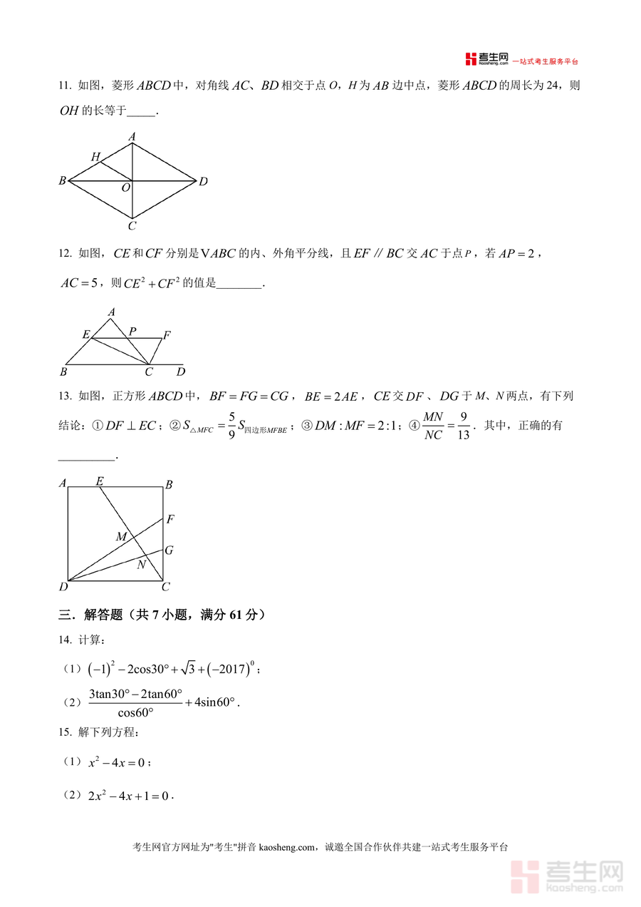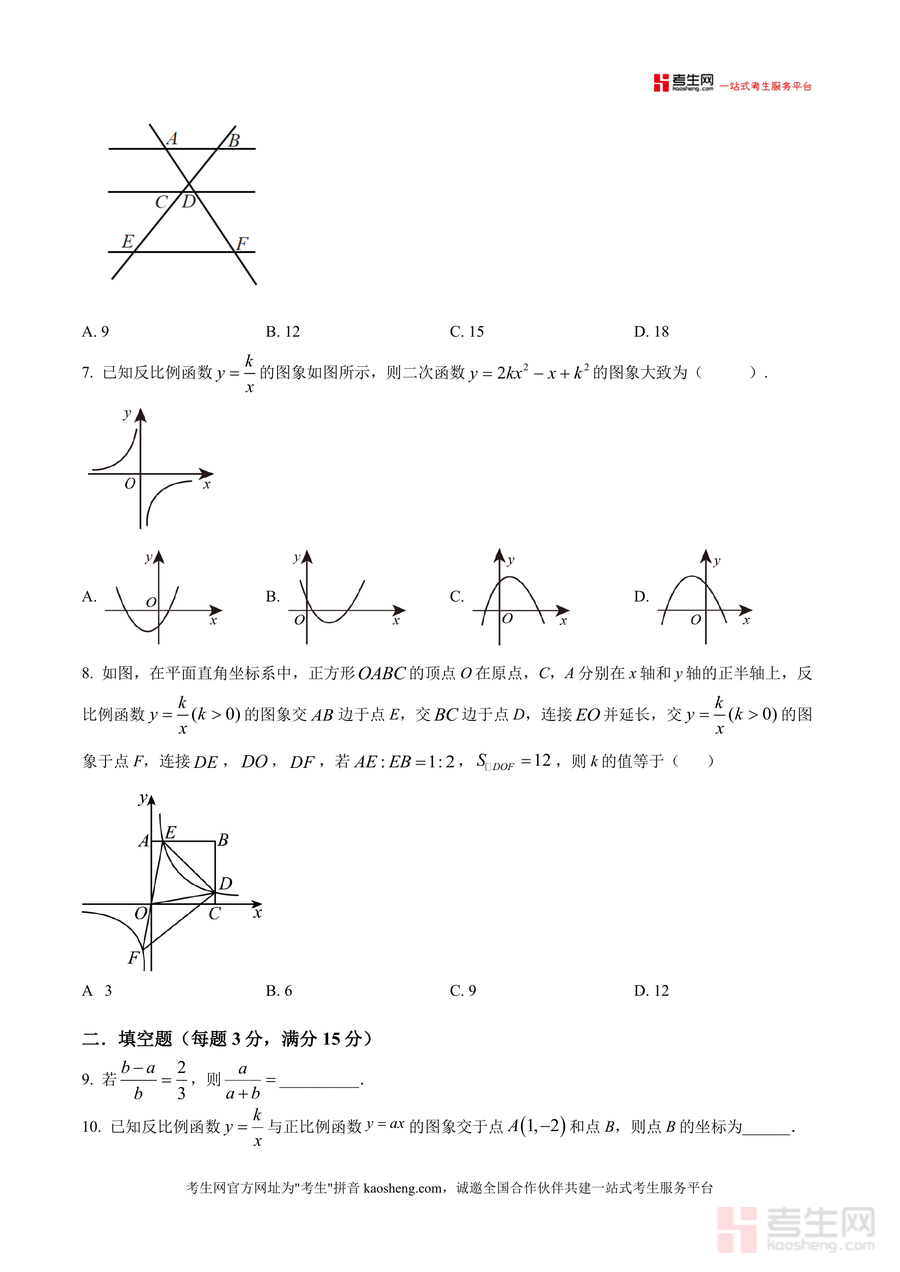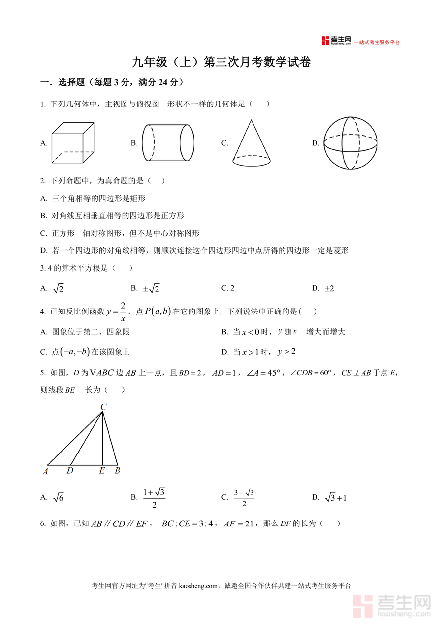 《精品解析:广东省深圳市宝安第一外国语学校2025-2026学年九年级上学期第三次月考数学试卷(原卷版).docx》是一份针对深圳宝一外九年级上学期第三次月考数学科目的专业备考资料。其主要内容涵盖选择题、填空题、解答题三大题型共20道题目,覆盖几何体主视图与俯视图判断、真命题识别、算术平方根计算、反比例函数图像性质、几何图形全等与相似证明等核心知识点。特色亮点在于严格遵循该校月考命题风格与分值分布,选择题每题3分共24分、填空题每题3分共15分、解答题共61分,全面还原真实考试场景,为学生提供精准匹配的真题训练素材。